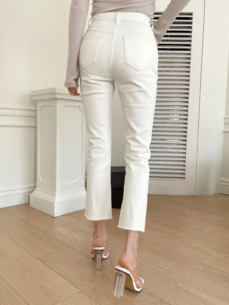 Ulepsz swój styl dzięki naszym dżinsowym spodniom z prostymi nogawkami, które stanowią idealne połączenie wygody i mody. Wykonane z wysokiej jakości białej bawełny i elastanu, spodnie te oferują niezrównaną miękkość, którą będziesz nosić przez cały dzień, każdego dnia.