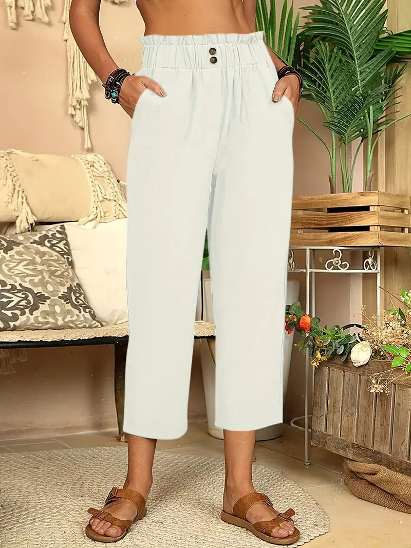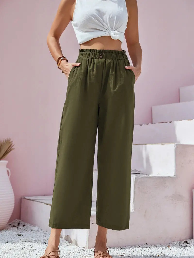 Unsere Hose mit weitem Bein und Knopfleiste sind Ihre erste Wahl für lässigen Komfort im Frühling und Sommer. Die Hose hat eine lockere Passform für mehr Bewegungsfreiheit und verfügt über eine stilvolle Knopfleiste, die Ihrem Look einen Hauch von Raffinesse verleiht. Perfekt für warme Tage, bietet sie Vielseitigkeit und mühelosen Stil für jede Gelegenheit.