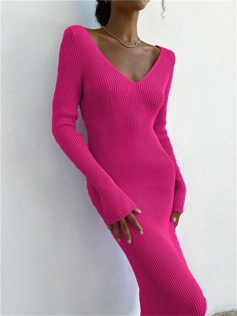 Aloisia - Casualowa dzianinowa sukienka ołówkowa midi z długim rękawem i dekoltem w szpic, bez pleców