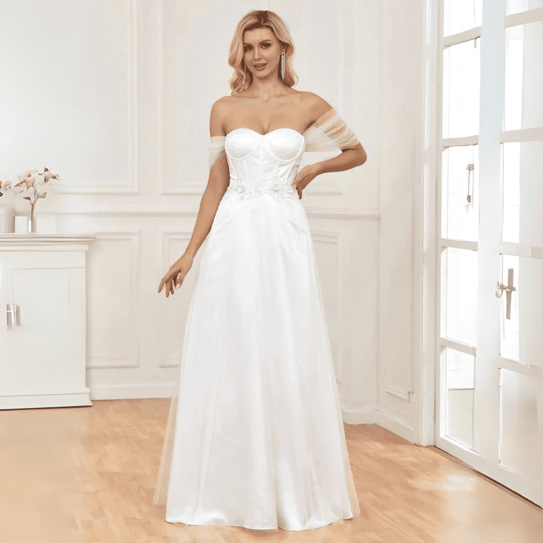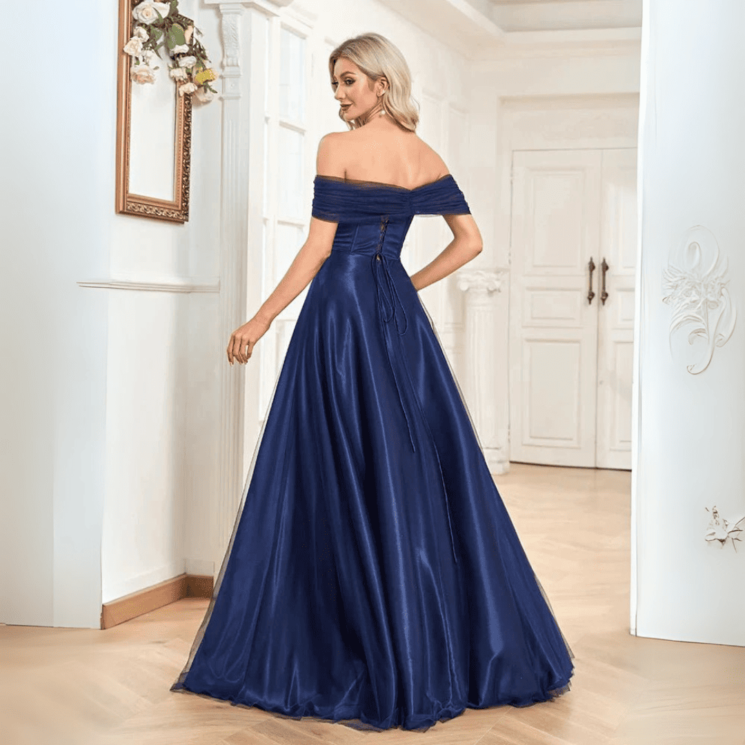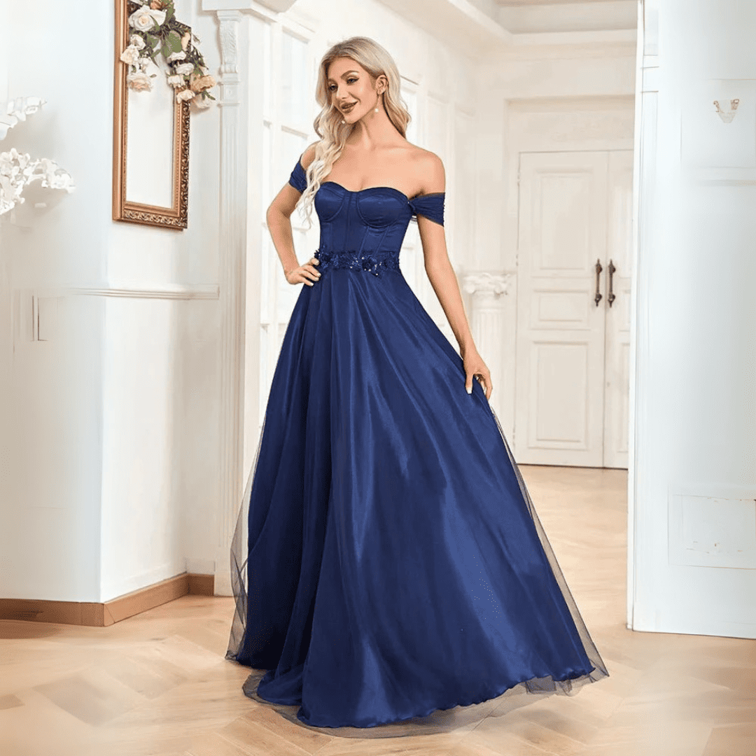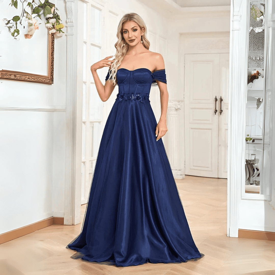 Spraw, aby bal maturalny był niezapomnianym wydarzeniem dzięki tej oszałamiającej granatowej sukni w kroju A-linii z odkrytymi ramionami. Zaprojektowana z podkreślającym figurę stanem w stylu empire, elegancką długością do ziemi i wbudowanym biustonoszem dla maksymalnego komfortu, ta suknia to idealne połączenie stylu, wyrafinowania i nowoczesnego uroku.