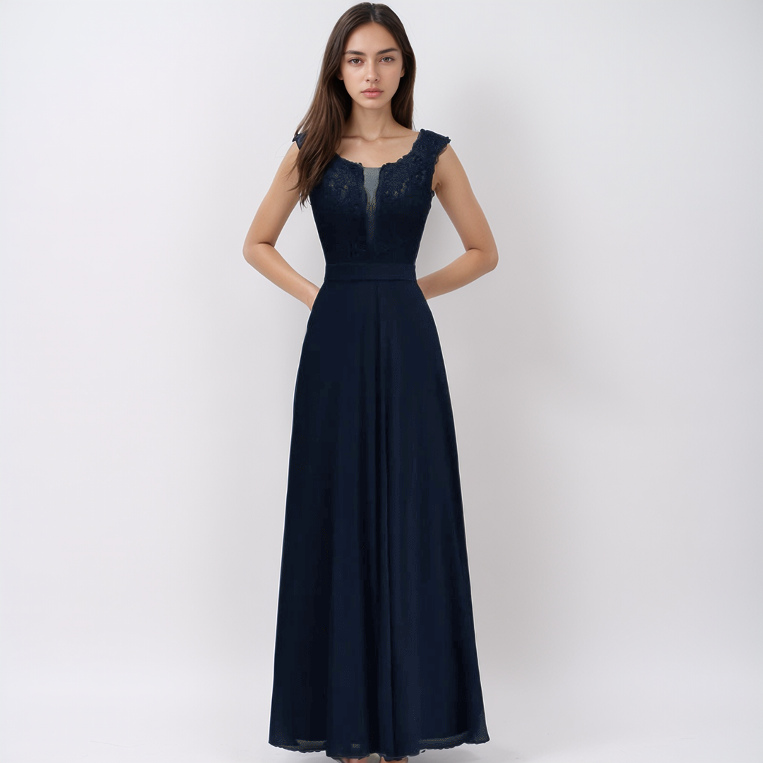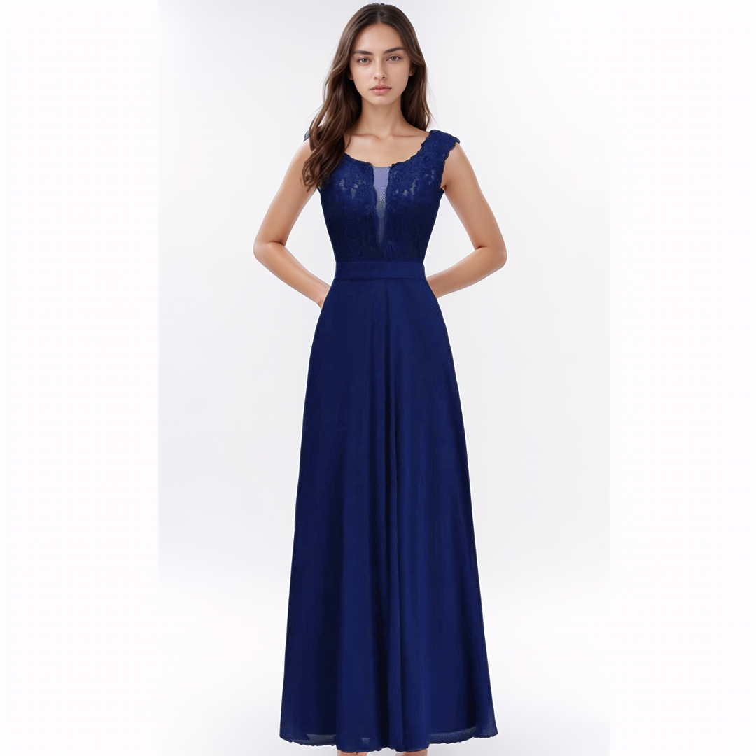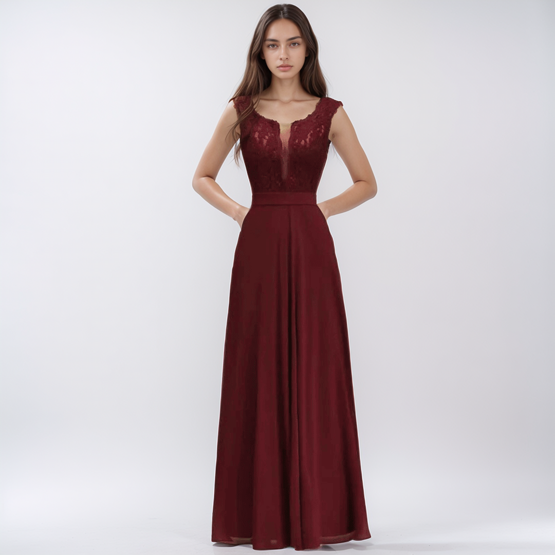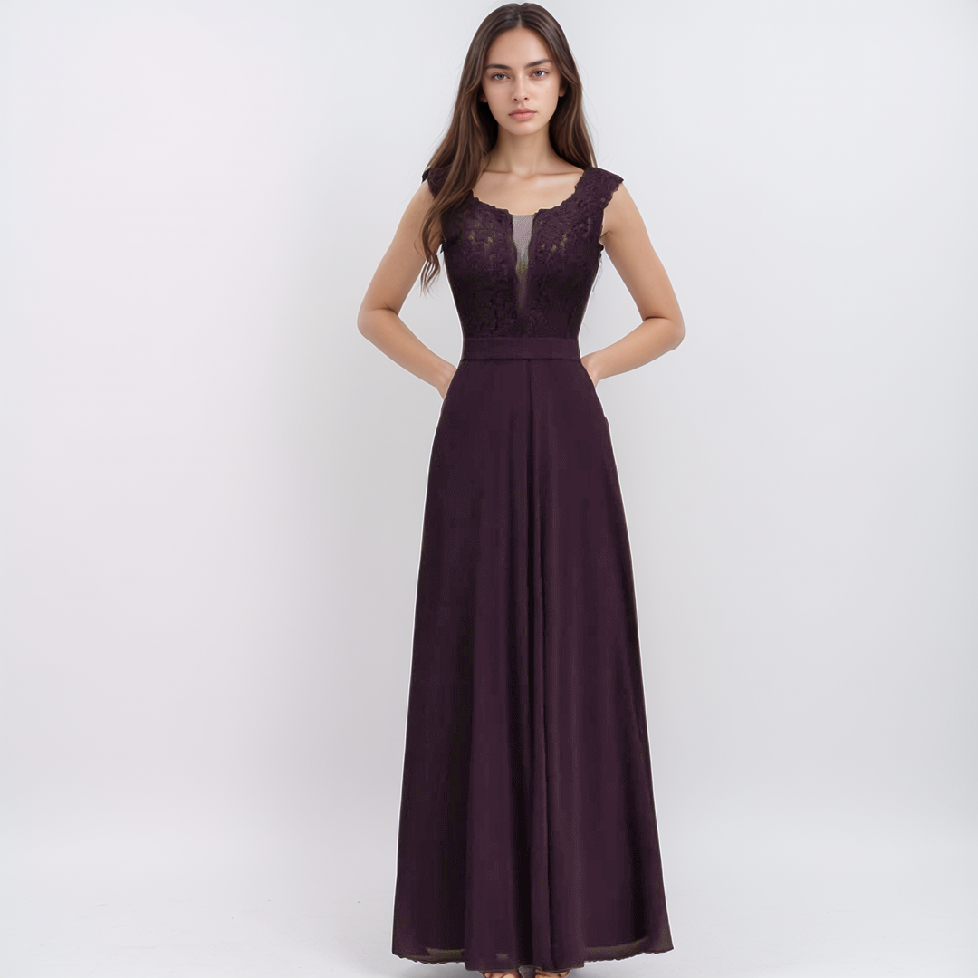 Wybierz klasyczną elegancję w tej szyfonowej sukience dla druhny ozdobionej koronkowymi aplikacjami. Subtelny dekolt w łódkę i zwiewny krój w kształcie litery A tworzą styl pełen wdzięku i uroku. Wbudowany stanik zapewnia wygodę, a długość do ziemi podkreśla wytworność na każdą okazję.