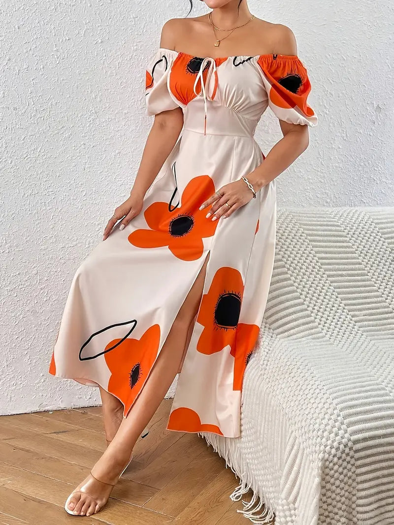 Casualowa sukienka Bohemian - Letnia sukienka z odkrytymi ramionami z kwiatowym nadrukiem i kołyszącym się wyglądem