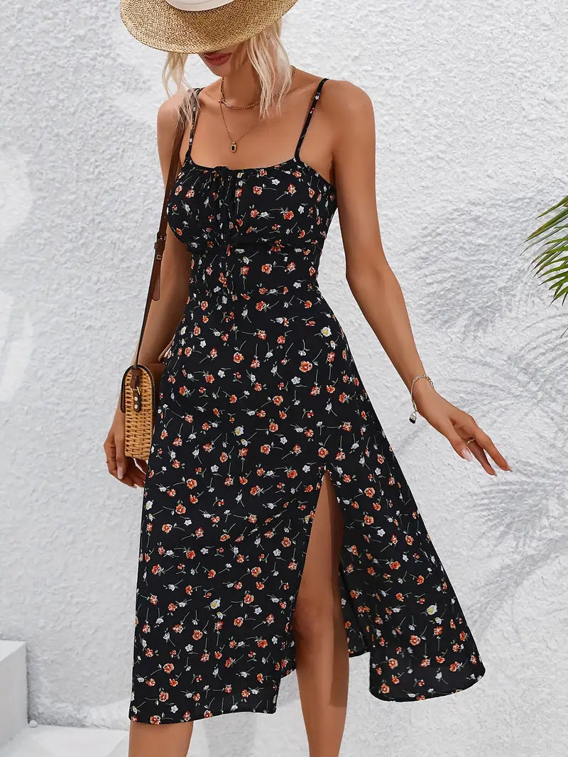 Czarna letnia sukienka maxi z eleganckim rozcięciem i ramiączkami spaghetti
