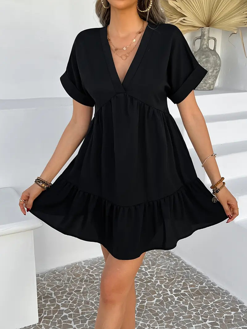 Ulepsz swoją letnią garderobę dzięki tej eleganckiej czarnej letniej sukience. Wykonana z wysokiej jakości poliestru sukienka jest lekka i przewiewna, idealna na gorące dni. Swobodny krój w kształcie litery A i dekolt w kształcie litery V tworzą pochlebny wygląd, a krótkie rękawy zapewniają dodatkowy komfort.