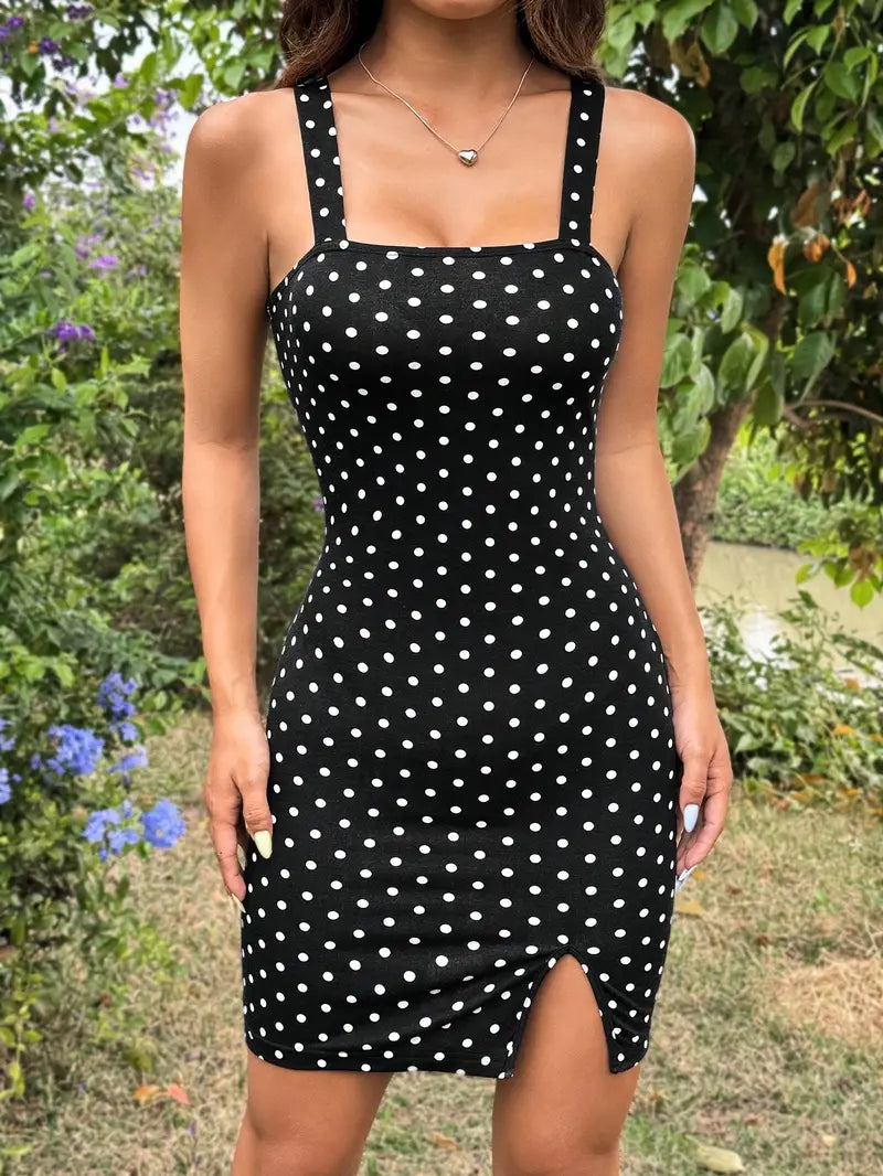 Ta stylowa mini sukienka bodycon w zabawne kropki to idealne połączenie elegancji i kobiecości. Dopasowany krój podkreśla sylwetkę, a subtelne rozcięcie i ramiączka typu spaghetti tworzą wyrafinowany wygląd. Idealna na letnie imprezy, wieczorne wyjścia lub szykowny casualowy look. Dostępna w wielu kolorach.