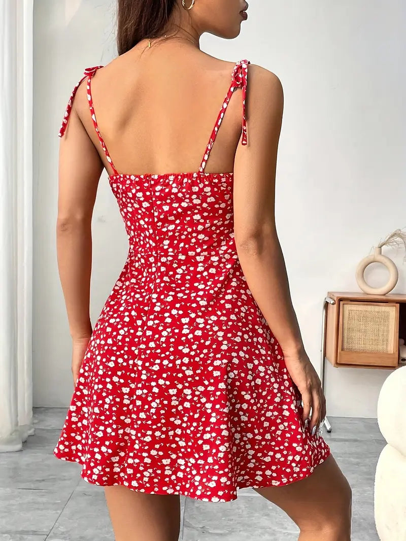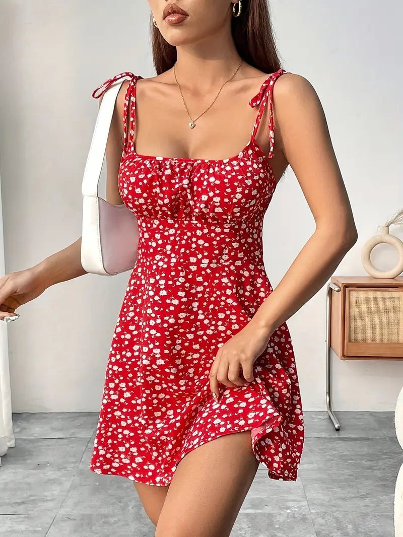 Czerwona letnia sukienka z kwiatowym nadrukiem Przewiewna i elegancka z zapięciem na kokardę