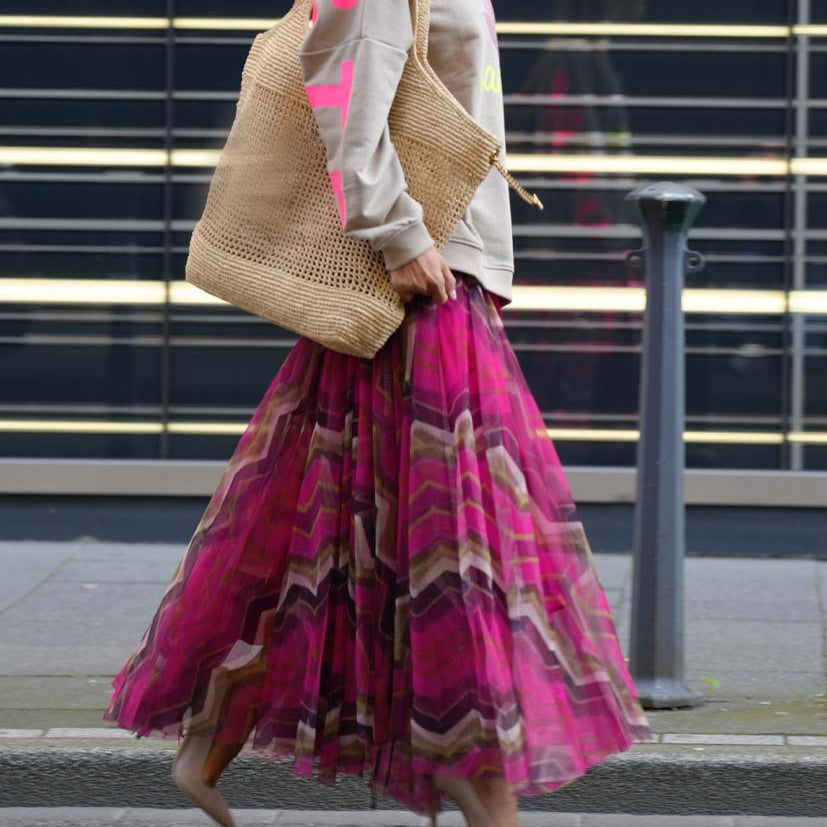 Drukowana długa spódnica z poliestru o szerokim obszyciu została zaprojektowana z myślą o komforcie i wszechstronności. Wykonana z lekkiego poliestru, oferuje swobodny, długi krój z szerokim obszyciem, co zapewnia lekkość i płynność ruchu. Geometryczny wzór dodaje jej wyjątkowego charakteru, ułatwiając łączenie z różnymi stylizacjami na różne okazje. Dzięki nieelastycznej strukturze materiału spódnica zachowuje swój kształt, jednocześnie pięknie się układając. Dostępna w różnych wariantach kwiatowych wzorów, idealnie sprawdzi się o każdej porze roku – w ciepłe dni można ją zestawić z sandałami, a w chłodniejsze miesiące nosić w połączeniu z botkami i swetrami.