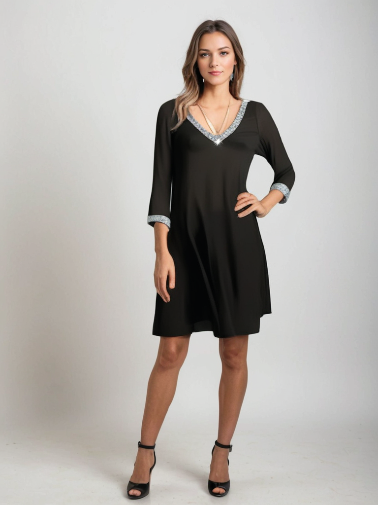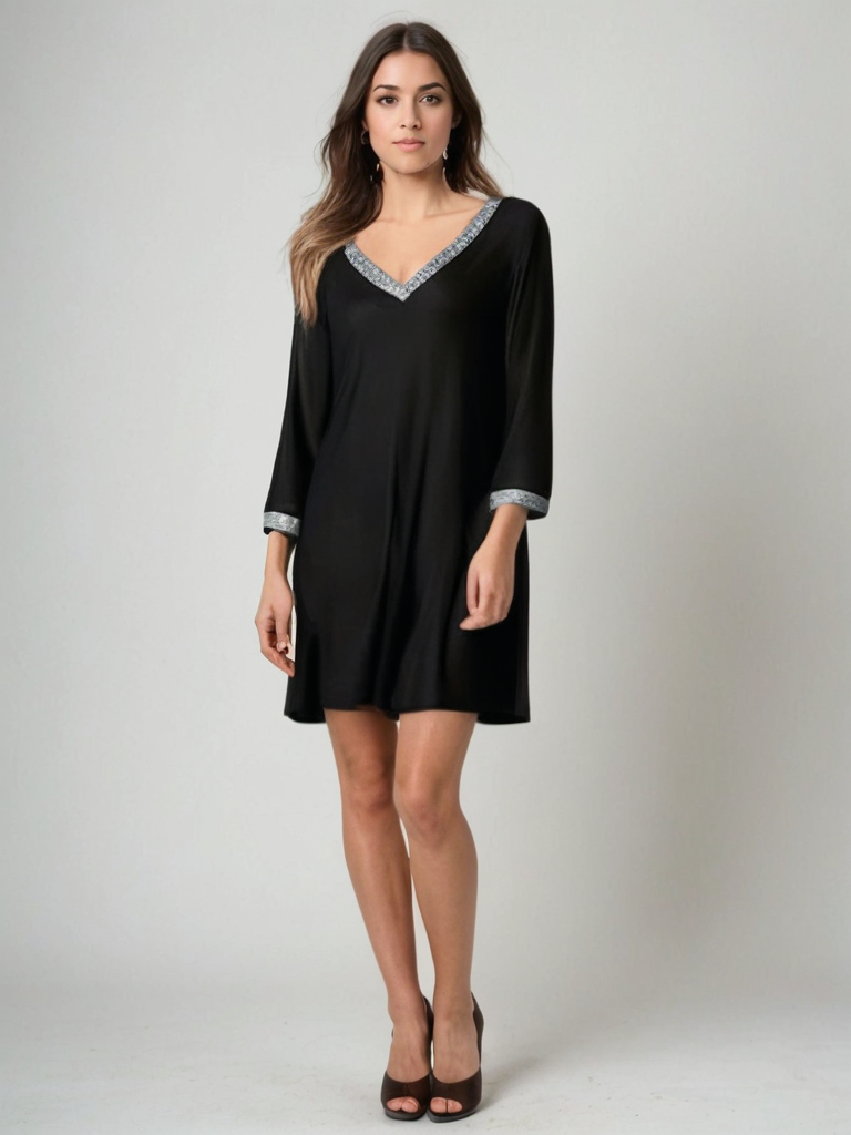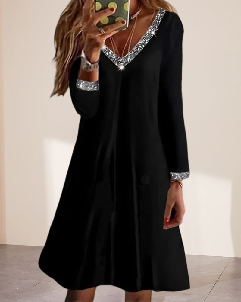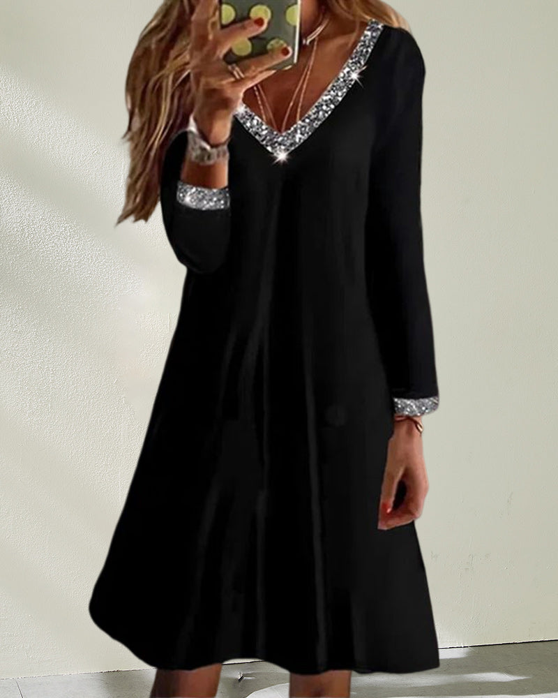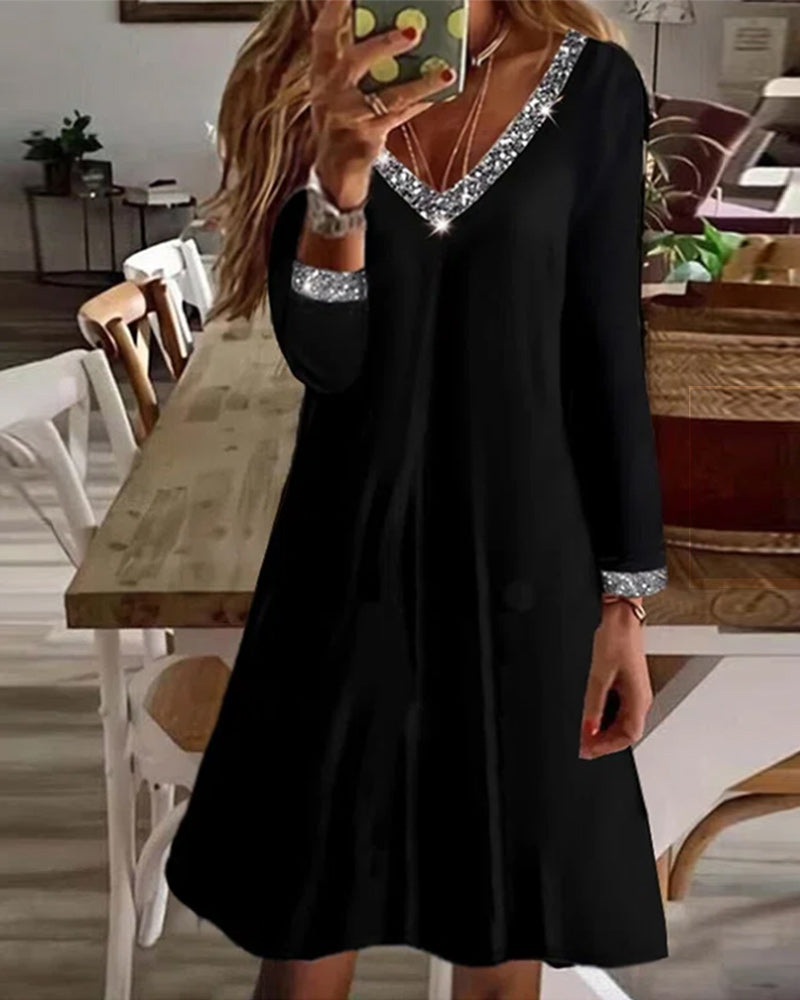 Entdecken Sie unser elegantes, einfarbiges Kleid mit funkelnden Pailletten und verführerischem V-Ausschnitt. Dieses knielange A-Linien-Kleid mit langen Ärmeln ist ideal für besondere Anlässe und verleiht Ihnen einen Hauch von Glamour. Gefertigt aus hochwertigen Baumwollmischungen, bietet es sowohl Stil als auch Komfort.