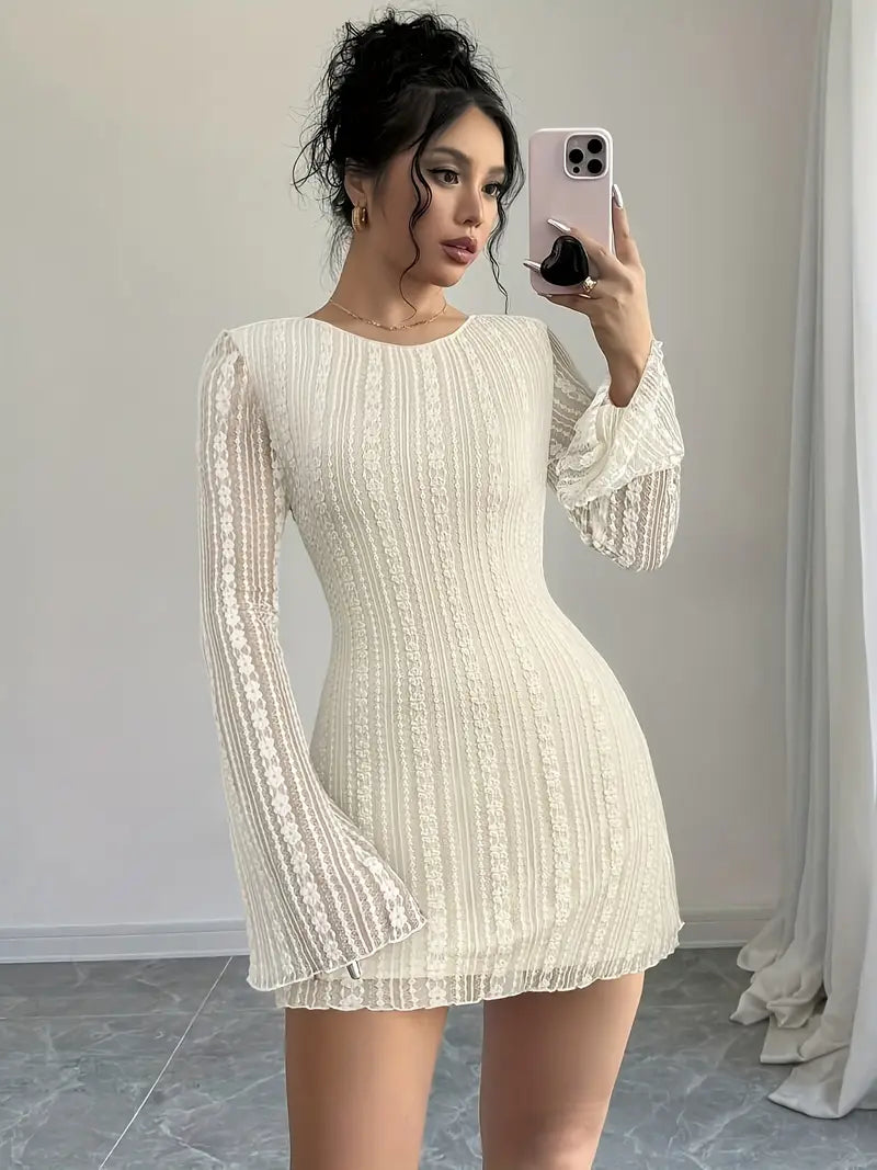 Ta piękna koronkowa mini sukienka emanuje elegancją i klasą. Połączenie delikatnej koronki, odkrytych pleców i długich rękawów sprawia, że ta sukienka jest idealna na eleganckie przyjęcie koktajlowe, romantyczną kolację lub specjalną okazję. Dopasowany krój podkreśla sylwetkę, a przewiewny materiał zapewnia optymalny komfort noszenia. Dostępna w wielu kolorach, aby stworzyć idealny wygląd.