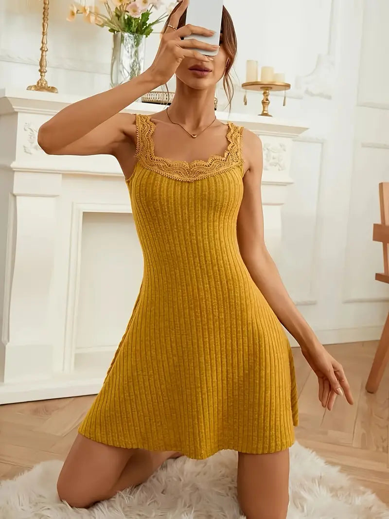 Elegancka letnia sukienka - musztardowa żółta midi bez rękawów z prążkowanym materiałem i dekoltem w szpic - wygodna i modna