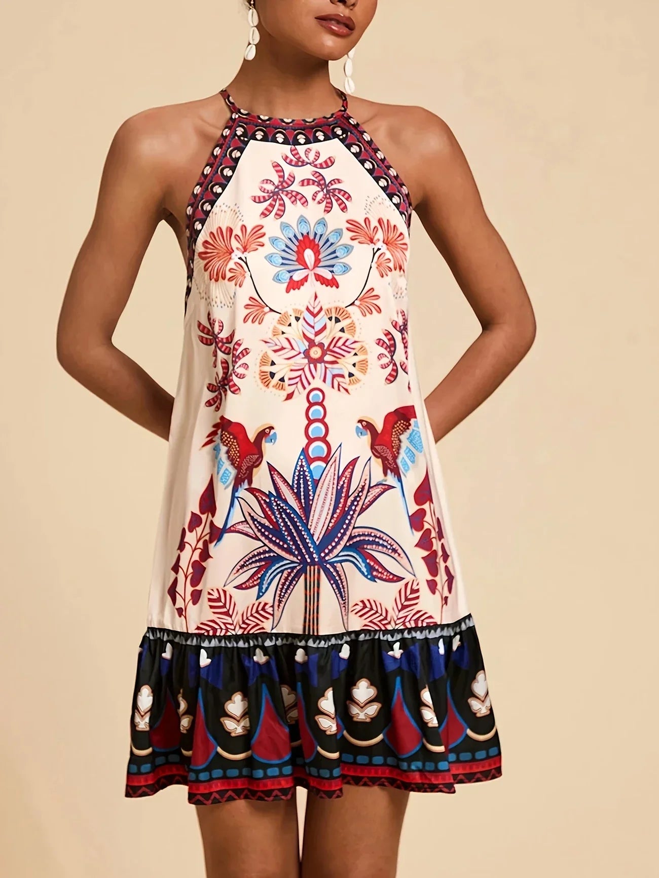 Ta piękna letnia sukienka z odkrytymi ramionami i kwiatowym nadrukiem emanuje elegancją i letnią świeżością. Przewiewny krój i miękki materiał zapewniają najwyższy komfort noszenia, idealny na gorące dni. Idealna na wakacje, plażę lub letnie imprezy. Noś sukienkę z sandałami, aby uzyskać swobodny wygląd lub ze szpilkami, aby uzyskać szykowny wygląd.