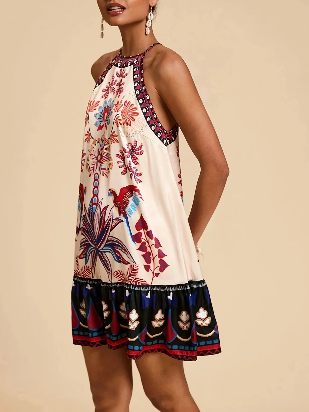 Elegancka letnia sukienka z kwiatowym nadrukiem - bez rękawów, z odkrytymi ramionami, przewiewna sukienka plażowa na wakacje i imprezy