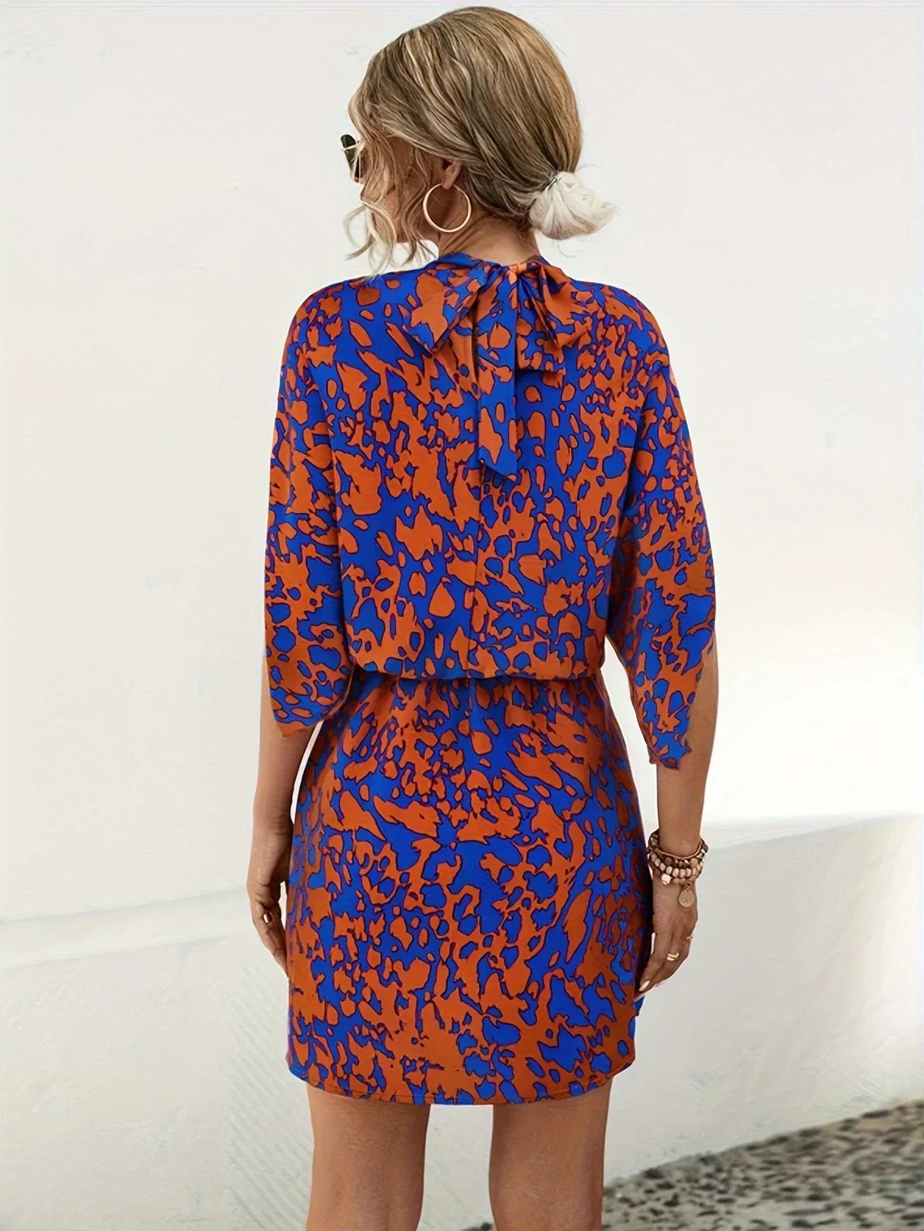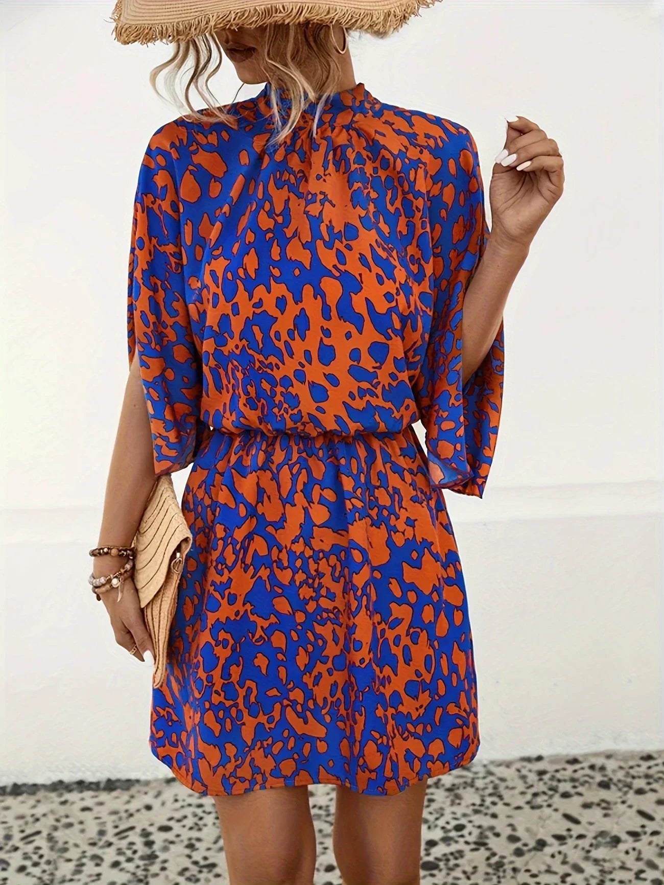 Ta modna mini sukienka z nadrukiem dalmatyńczyka przyciąga wzrok! Dekolt typu mock neck i rozcięte rękawy dodają jej elegancji, a krój bodycon o linii A zapewnia pochlebną sylwetkę. Wykonana z lekkiego i wygodnego materiału, jest idealna na gorące letnie dni lub uroczyste okazje. Połącz ją ze szpilkami i biżuterią, aby uzyskać szykowny wygląd, lub noś na co dzień z sandałami.
