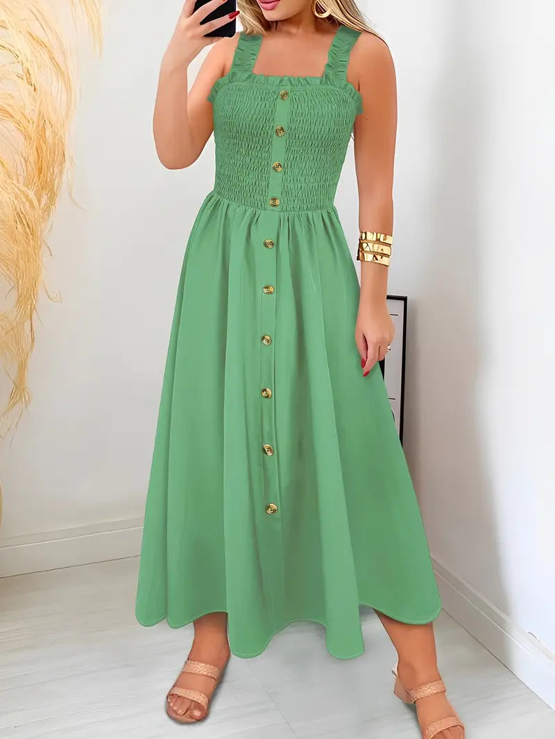 Ta elegancka sukienka maxi łączy stylowy wygląd z najwyższym komfortem. Przewiewny krój w kształcie litery A i bez rękawów sprawiają, że jest idealna na gorące letnie dni. Kwadratowy dekolt i zapięcie na guziki nadają jej klasyczny i wyrafinowany wygląd. Idealny na wakacje, letnie imprezy lub codzienne wyjścia. Dostępna w wielu kolorach pasujących do każdego stylu.