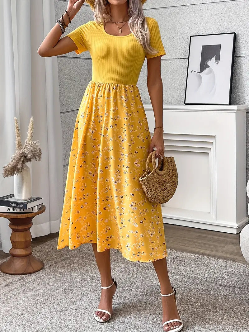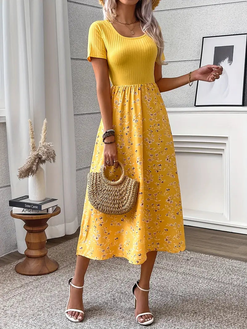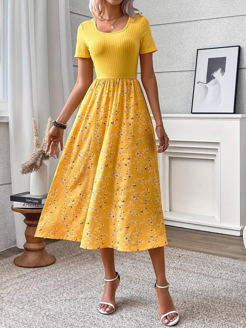 Elegancka sukienka w kwiaty z prążkowanymi detalami - letnia sukienka o linii A z krótkimi rękawami i okrągłym dekoltem