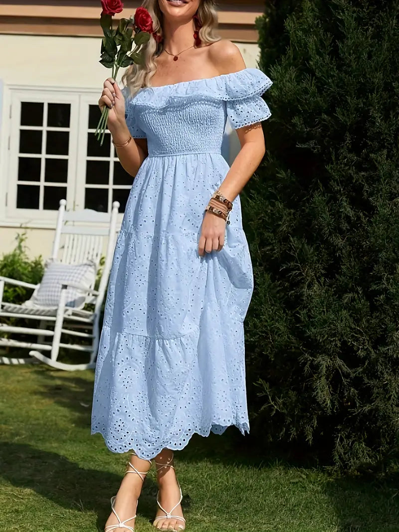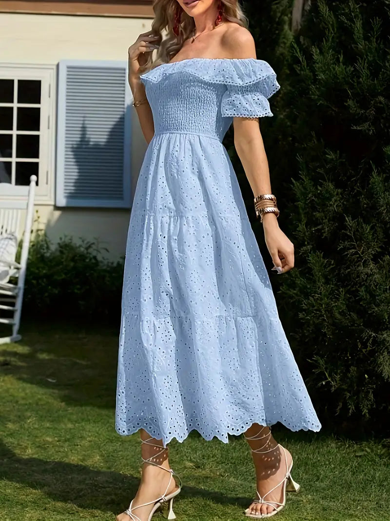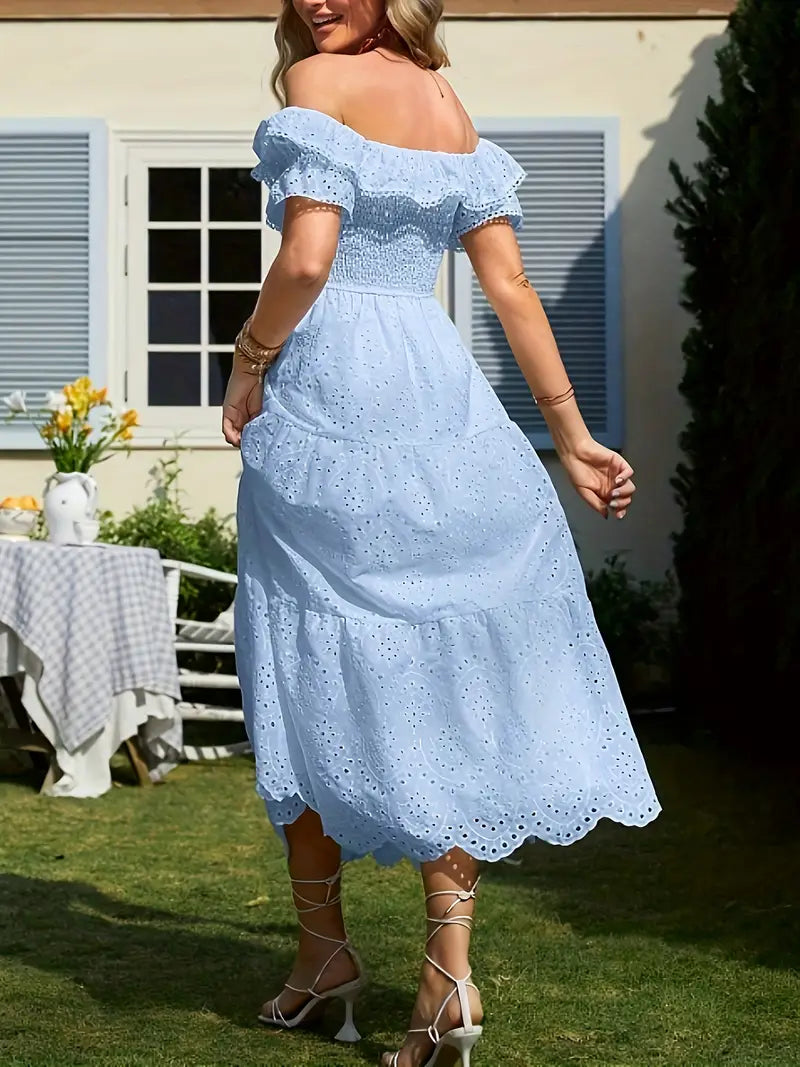 Ta wspaniała sukienka z odkrytymi ramionami to must-have na lato! Dzięki wyrafinowanemu koronkowemu haftowi i przewiewnym krótkim rękawom, ta sukienka emanuje czystą elegancją. Dopasowany krój i miękki, oddychający materiał zapewniają optymalny komfort podczas upalnych dni. Idealna na letni spacer, imprezę lub romantyczną kolację. Połącz z sandałami, aby uzyskać swobodny wygląd lub szpilkami, aby uzyskać szykowny wygląd!