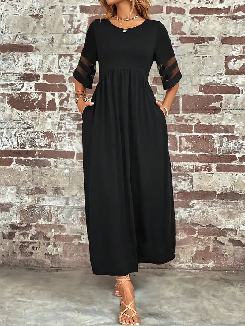 Ta gładka sukienka plus size z siateczkowymi detalami to elegancja bez wysiłku. Zaprojektowana z pochlebnym okrągłym dekoltem i stylowymi półrękawkami, ta sukienka jest idealna na wiosenne i letnie okazje. Delikatne siateczkowe detale dodają wyrafinowania, dzięki czemu sukienka jest idealna na swobodne wyjścia, do pracy lub na specjalne okazje. Zachowaj wygodę i styl dzięki tej obowiązkowej pozycji w swojej garderobie.