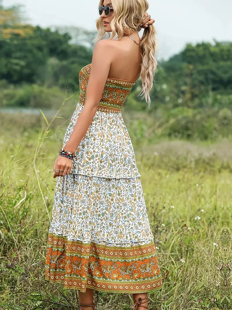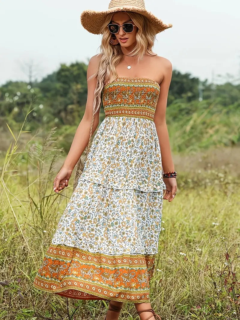 Elegancka zawijana sukienka - drukowana sukienka midi z dekoltem w szpic i talią, idealna na lato i wieczór