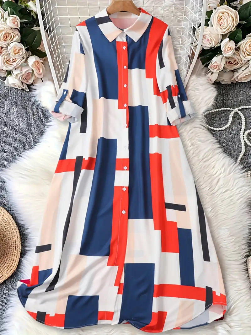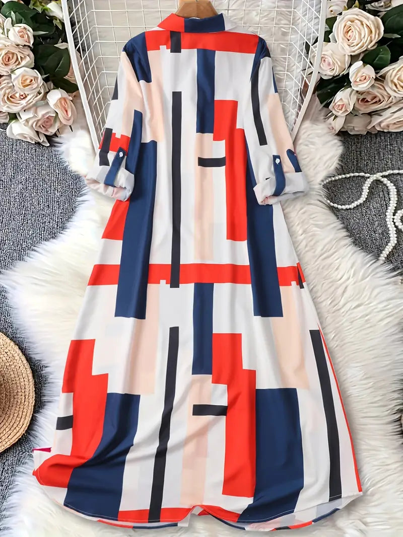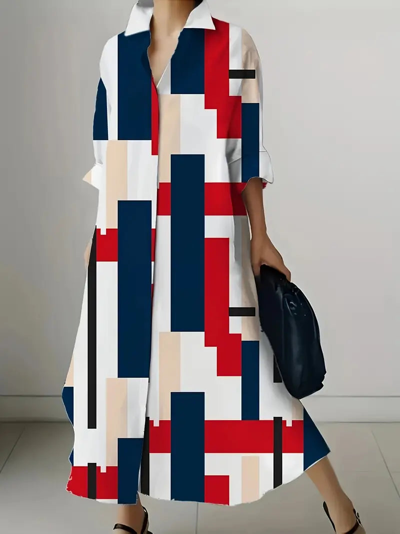Geometryczna długa sukienka z kołnierzykiem i podwiniętymi rękawami