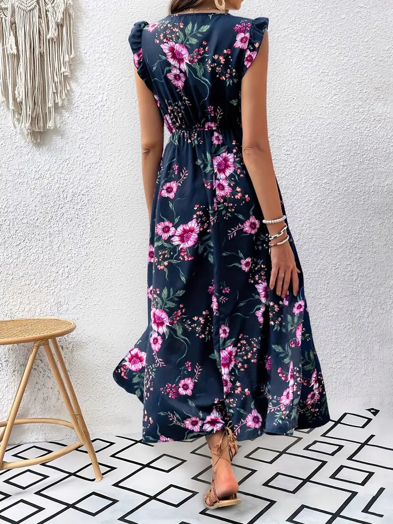 Granatowa Sukienka z kwiatowym nadrukiem Dekolt w serek Falbana Rękawy Rozcięcie