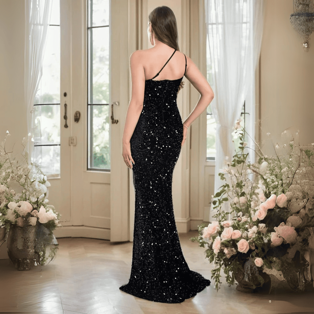 Wejdź w światło reflektorów w tej urzekającej sukni na studniówkę z wysokim rozcięciem i cekinami. Wykonana z luksusowego aksamitu i olśniewających kryształków, ta długa, dopasowana suknia w kształcie syreny podkreśla Twoje kształty, wyróżniając się eleganckim, asymetrycznym krojem na jedno ramię i odważnym bocznym rozcięciem. Idealna na niezapomniane wieczory studniówkowe lub wspaniałe wydarzenia.