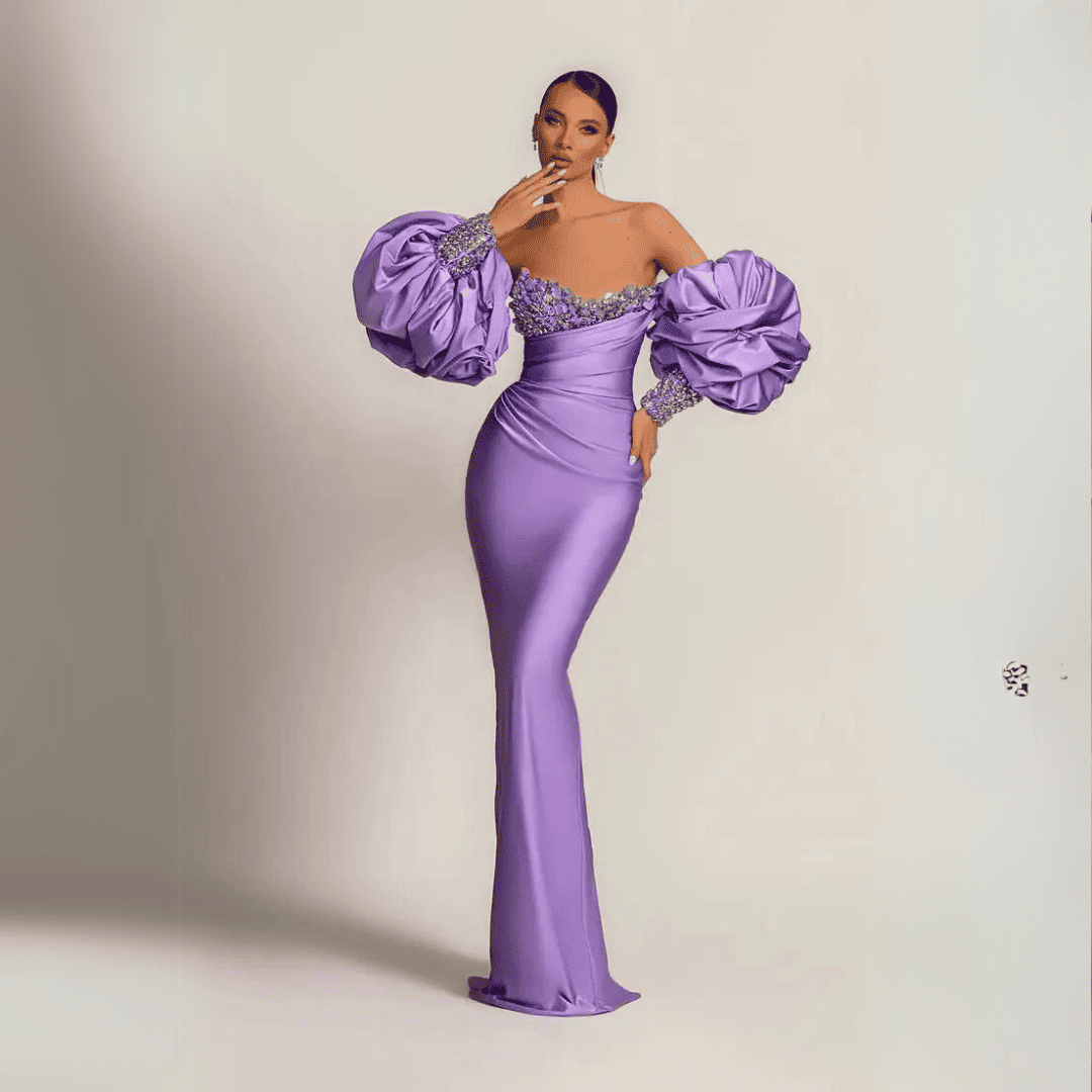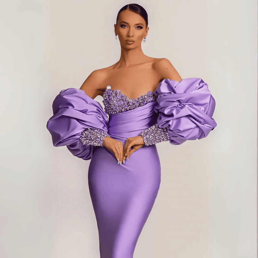 Poczuj się jak gwiazda w naszej liliowej sukni syrenie z cekinami – doskonałym wyborem dla druhny. Ta długa, podłogowa kreacja z dekoltem off-shoulder i puchatymi rękawami zachwyca elegancką sylwetką. Cekiny nadają blasku przy każdym ruchu, a zakładki dodają wyrafinowanego charakteru satynowemu materiałowi.
