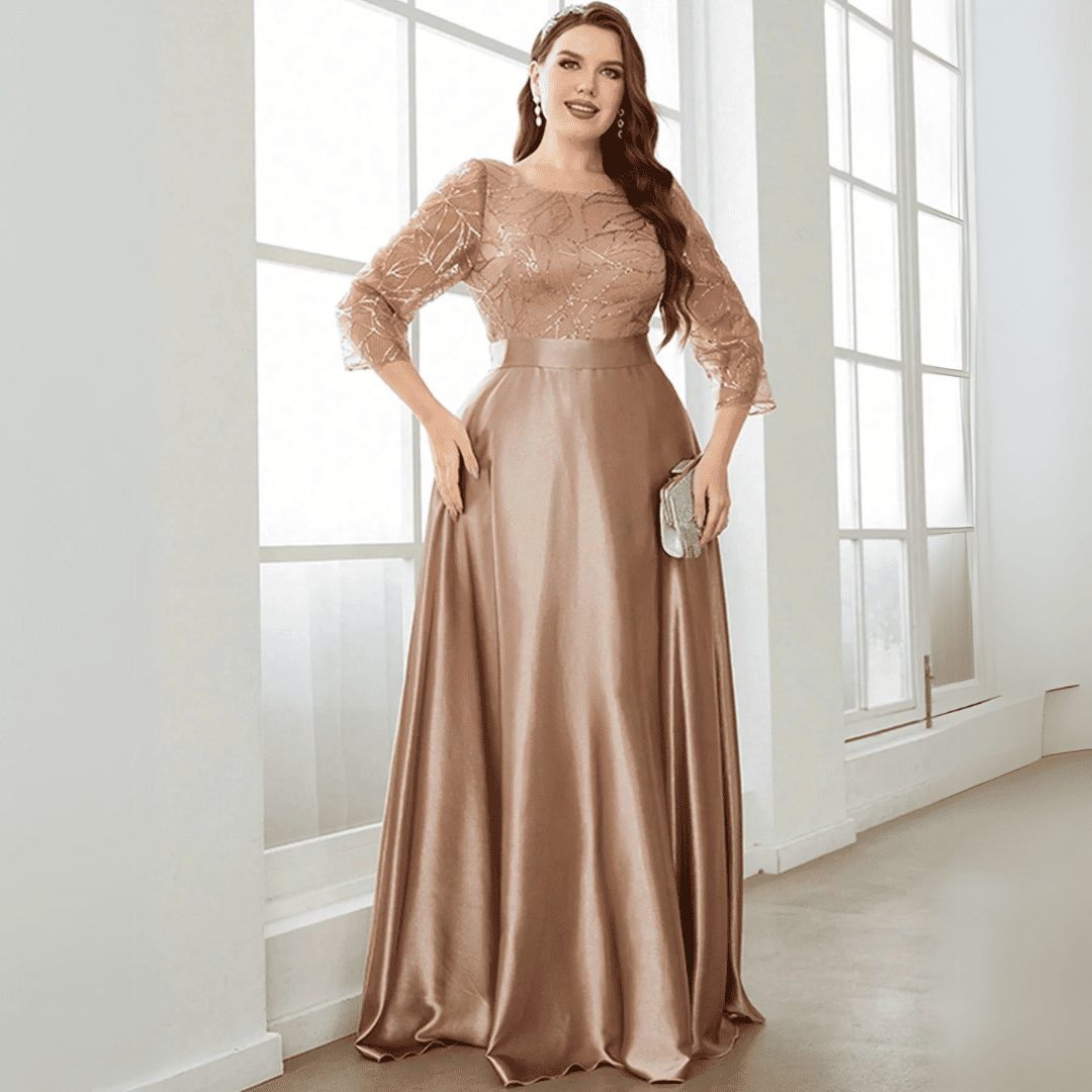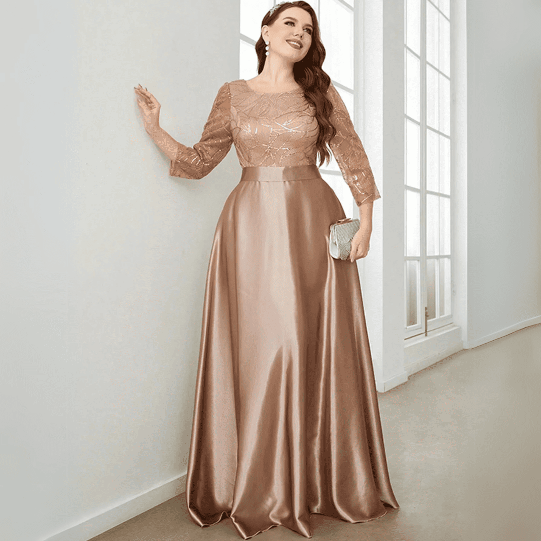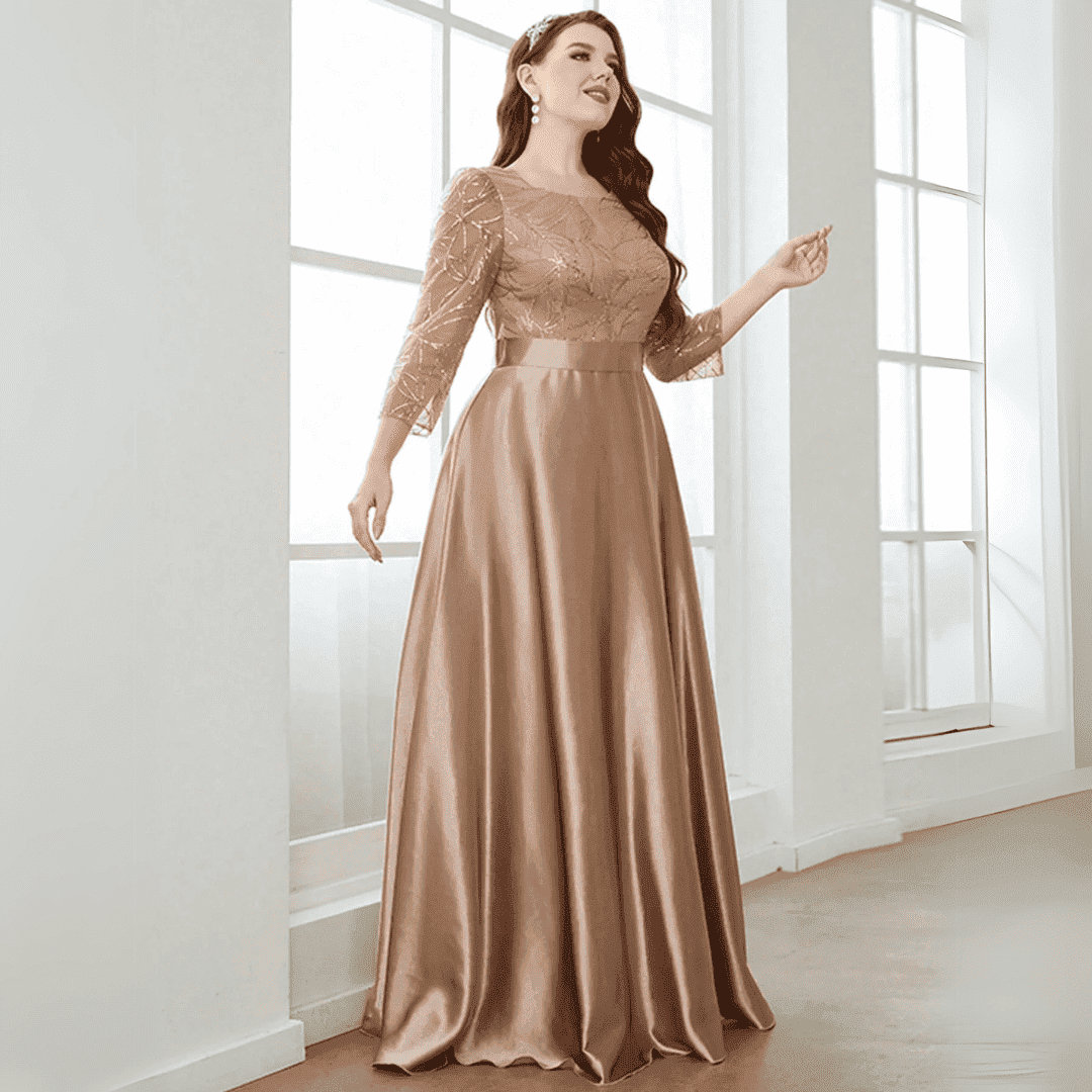 Zachwyć wszystkich swoim wyjątkowym stylem w tej olśniewającej sukni ślubnej z długimi rękawami. Klasyczny dekolt O i efektowne aplikacje podkreślają Twoją elegancję, podczas gdy satynowy materiał w kolorze szampańskim dodaje luksusowego wyrazu. Idealna na wieczorne przyjęcia i niezapomniane chwile!