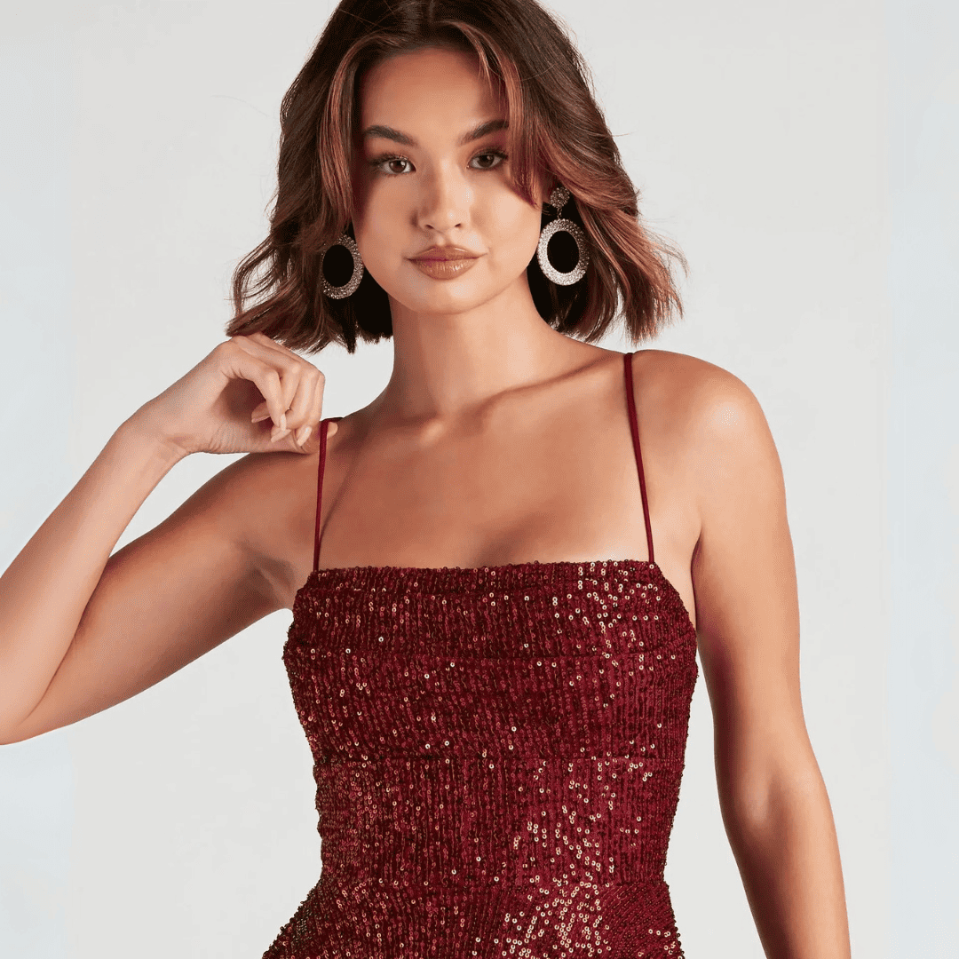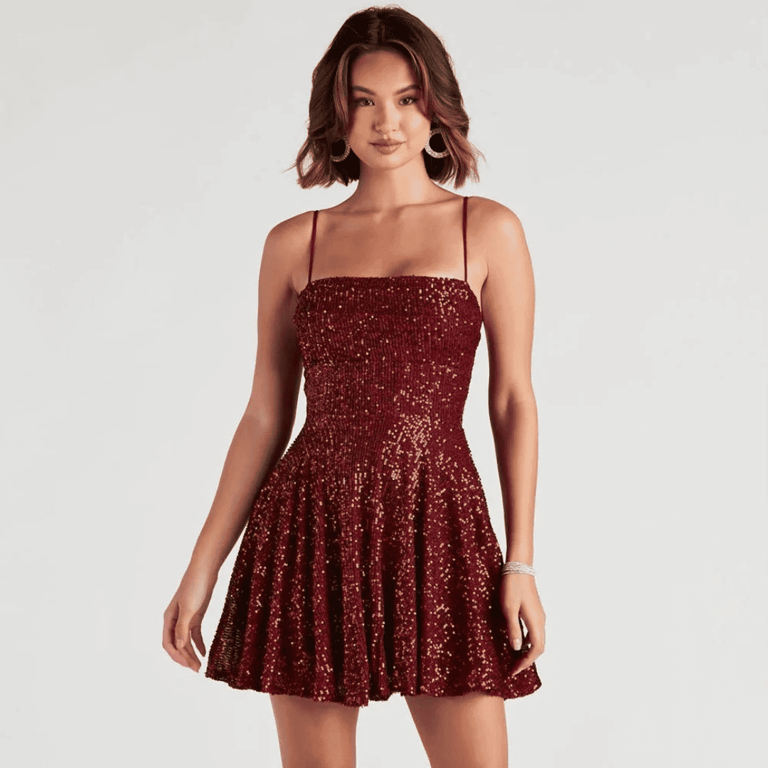 Zostań gwiazdą wieczoru w tej olśniewającej burgundowej sukience mini na studniówkę. Zmysłowy krój w kształcie litery A, połyskujące cekiny i elegancki kwadratowy dekolt z delikatnymi ramiączkami spaghetti sprawiają, że to idealny wybór na niezapomniane noce. Doskonała do tańca pod gwiazdami i przyciągania wszystkich spojrzeń!