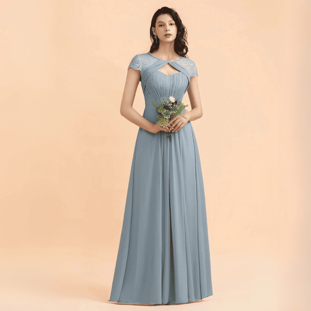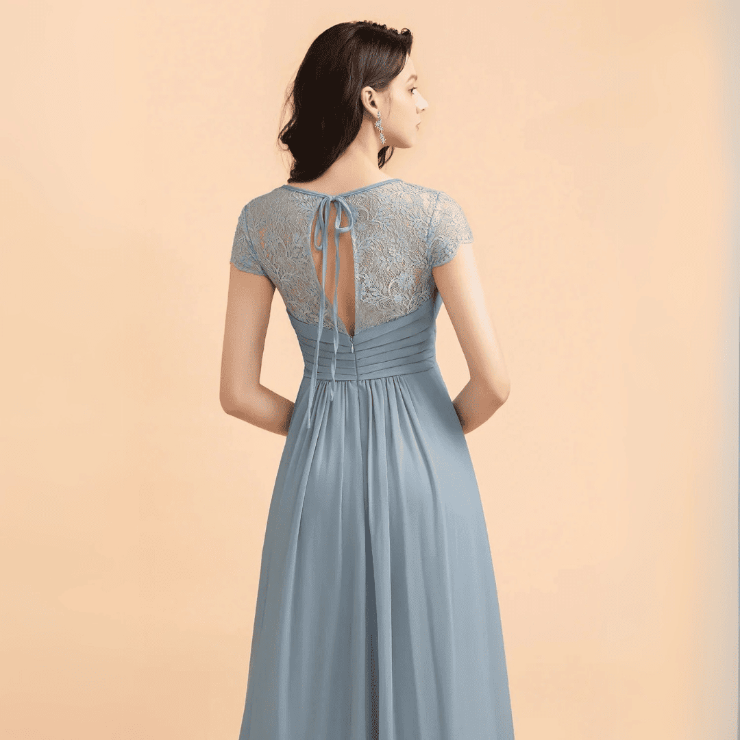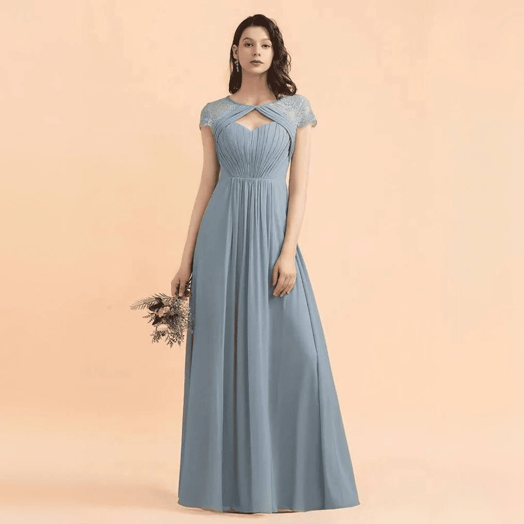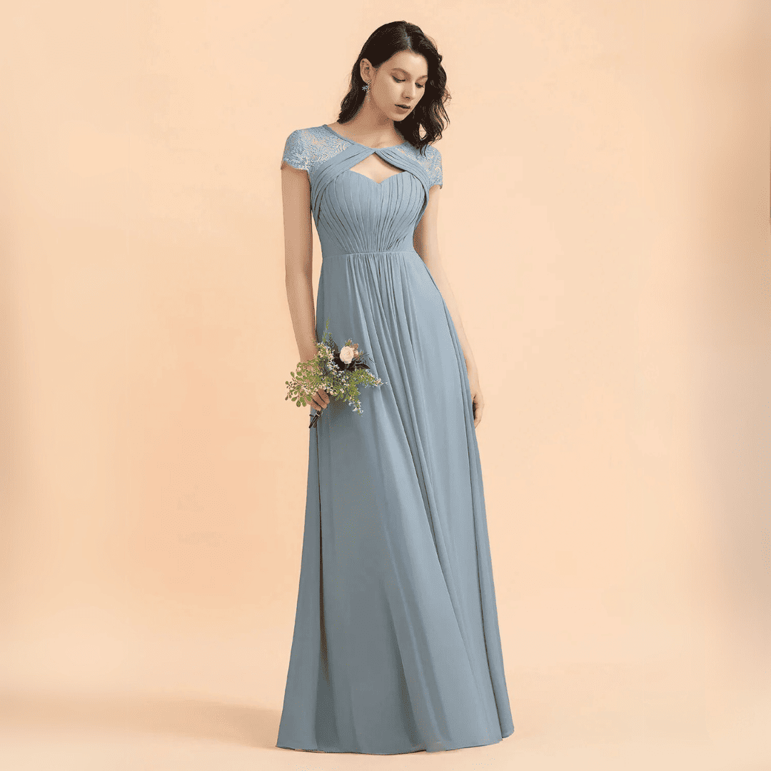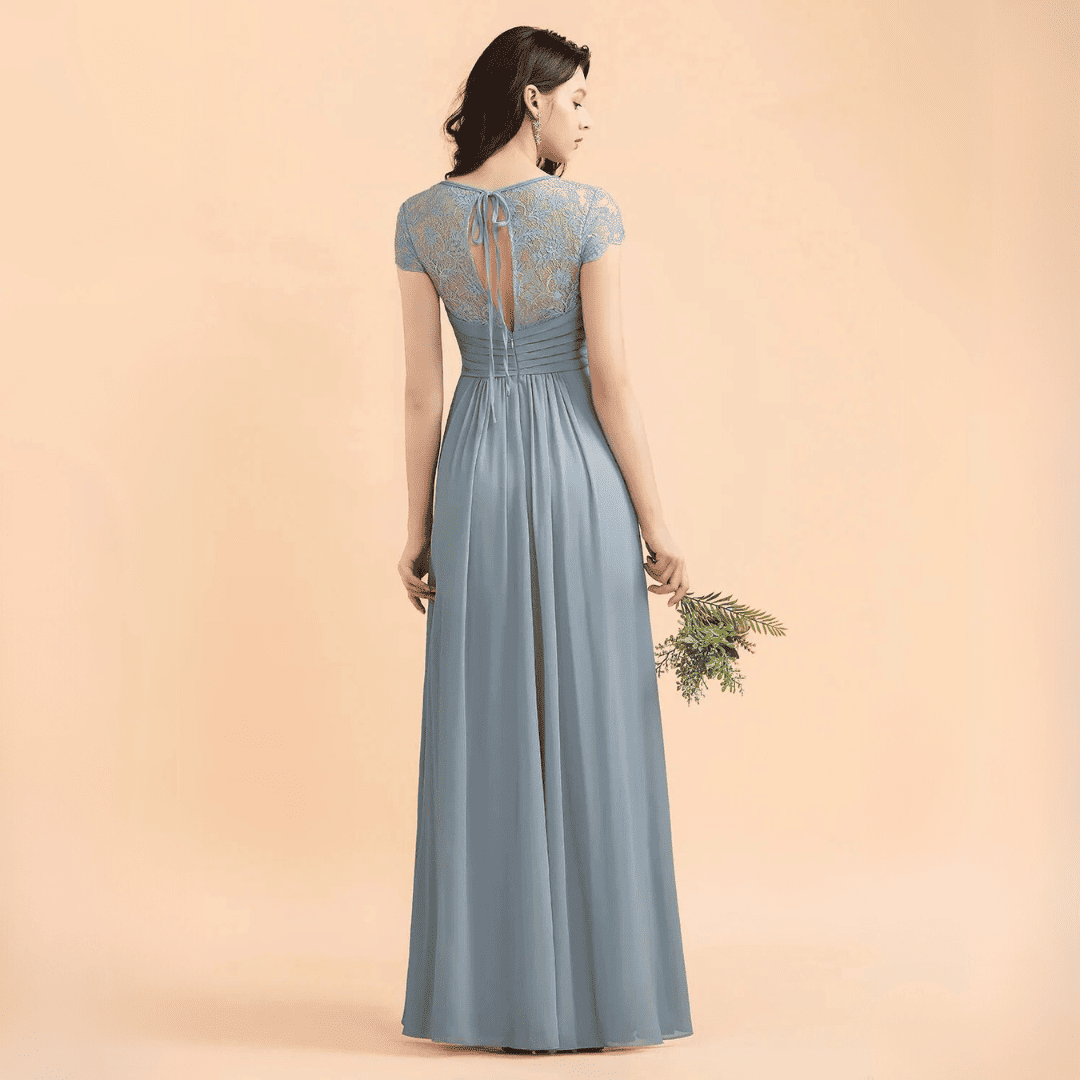 Dodaj odrobinę klasy do swojego wyjątkowego dnia dzięki tej szykownej sukience dla druhny w odcieniu dusty blue. Jej zwiewna sylwetka w kształcie litery A, krótkie rękawy oraz delikatne koronkowe aplikacje zapewniają ponadczasową elegancję i komfort podczas każdej uroczystości.