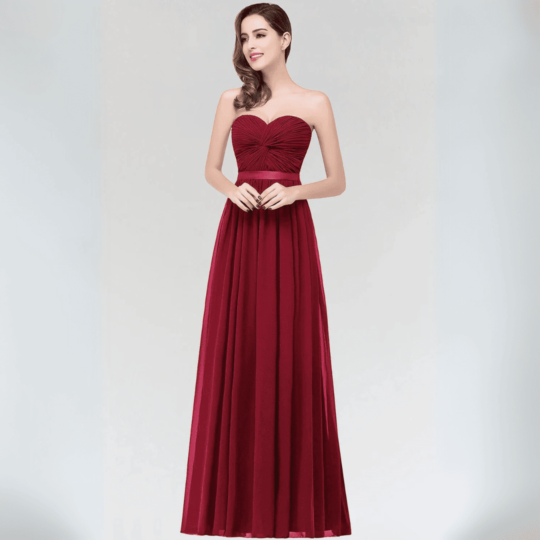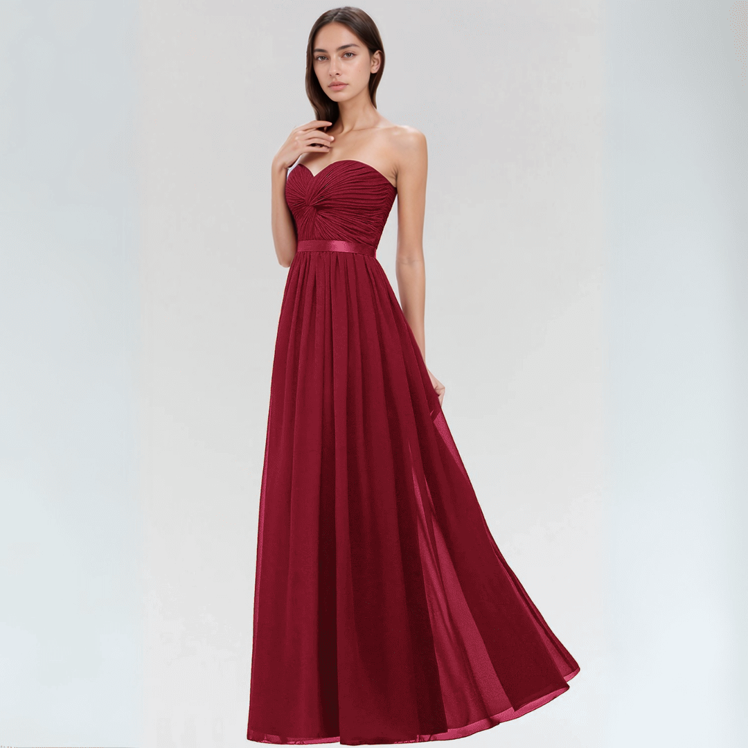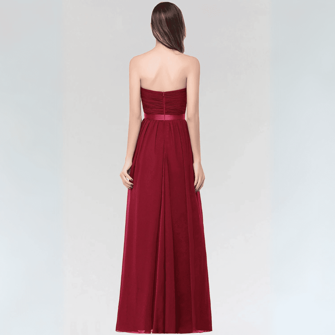 Wejdź w świat elegancji dzięki tej sukni z lekkiego szyfonu bez ramiączek, idealnej dla druhen lub na wieczorowe okazje. Sukienka charakteryzuje się krojem w kształcie litery A, odkrytymi plecami i stylowym paskiem, łącząc w sobie romantyzm i szyk. Dostępna w urzekającym kolorze burgunda oraz innych barwach, zaprojektowana z myślą o wygodzie i swobodnym ruchu.