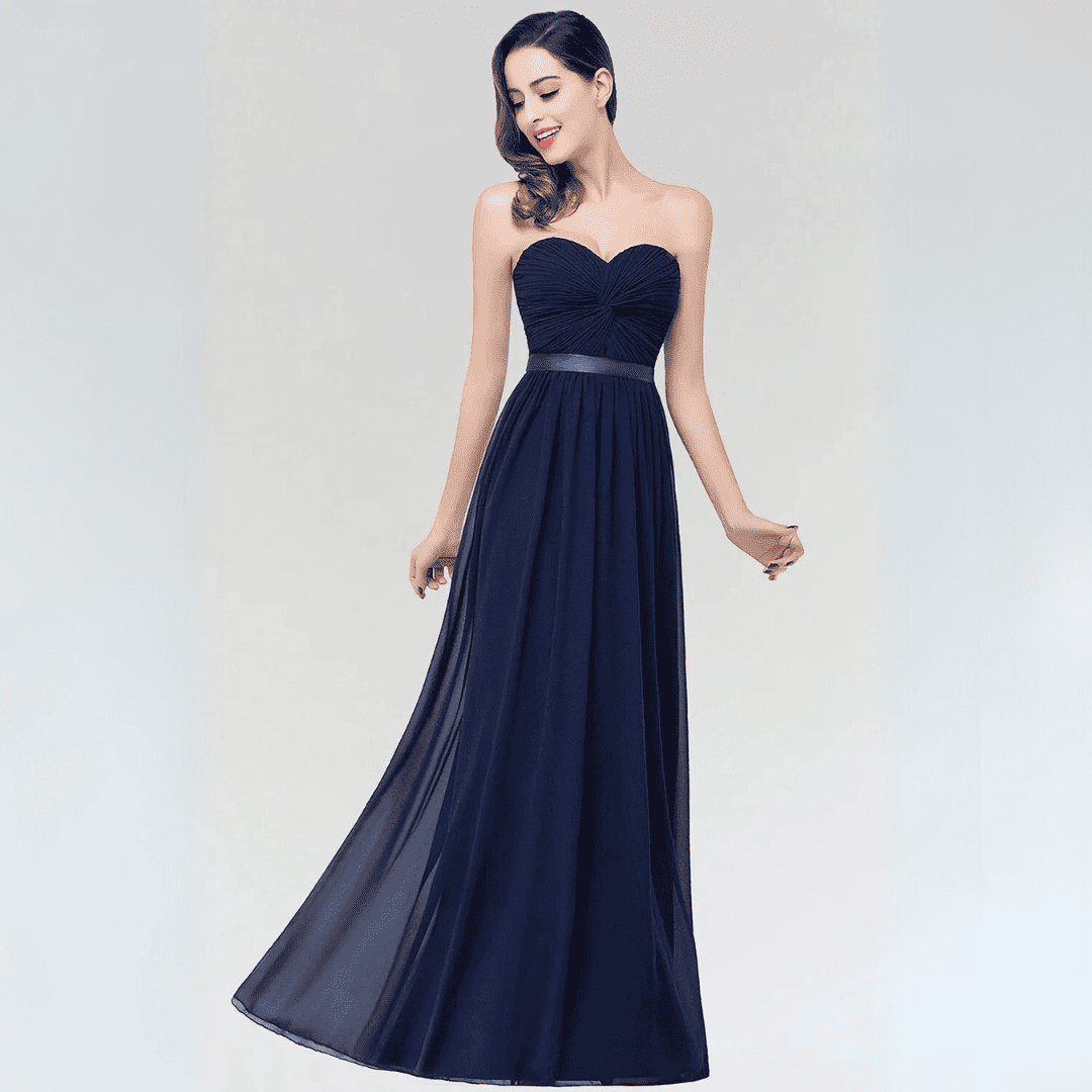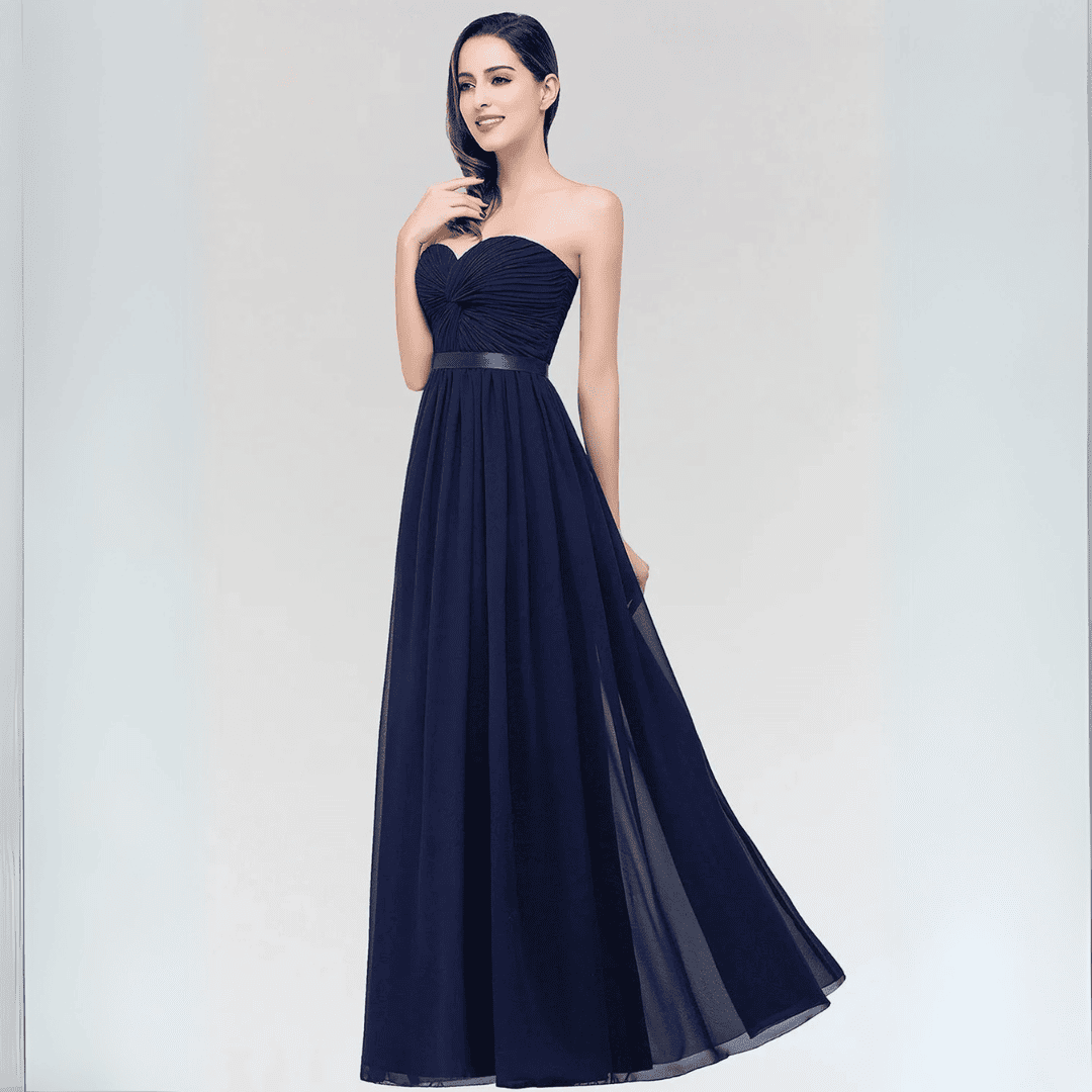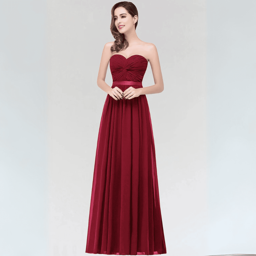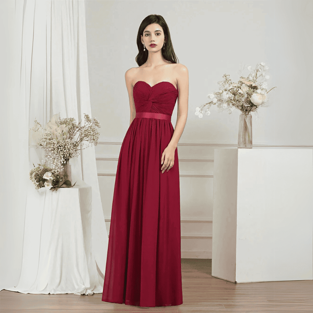 Wejdź w świat elegancji dzięki tej sukni z lekkiego szyfonu bez ramiączek, idealnej dla druhen lub na wieczorowe okazje. Sukienka charakteryzuje się krojem w kształcie litery A, odkrytymi plecami i stylowym paskiem, łącząc w sobie romantyzm i szyk. Dostępna w urzekającym kolorze burgunda oraz innych barwach, zaprojektowana z myślą o wygodzie i swobodnym ruchu.