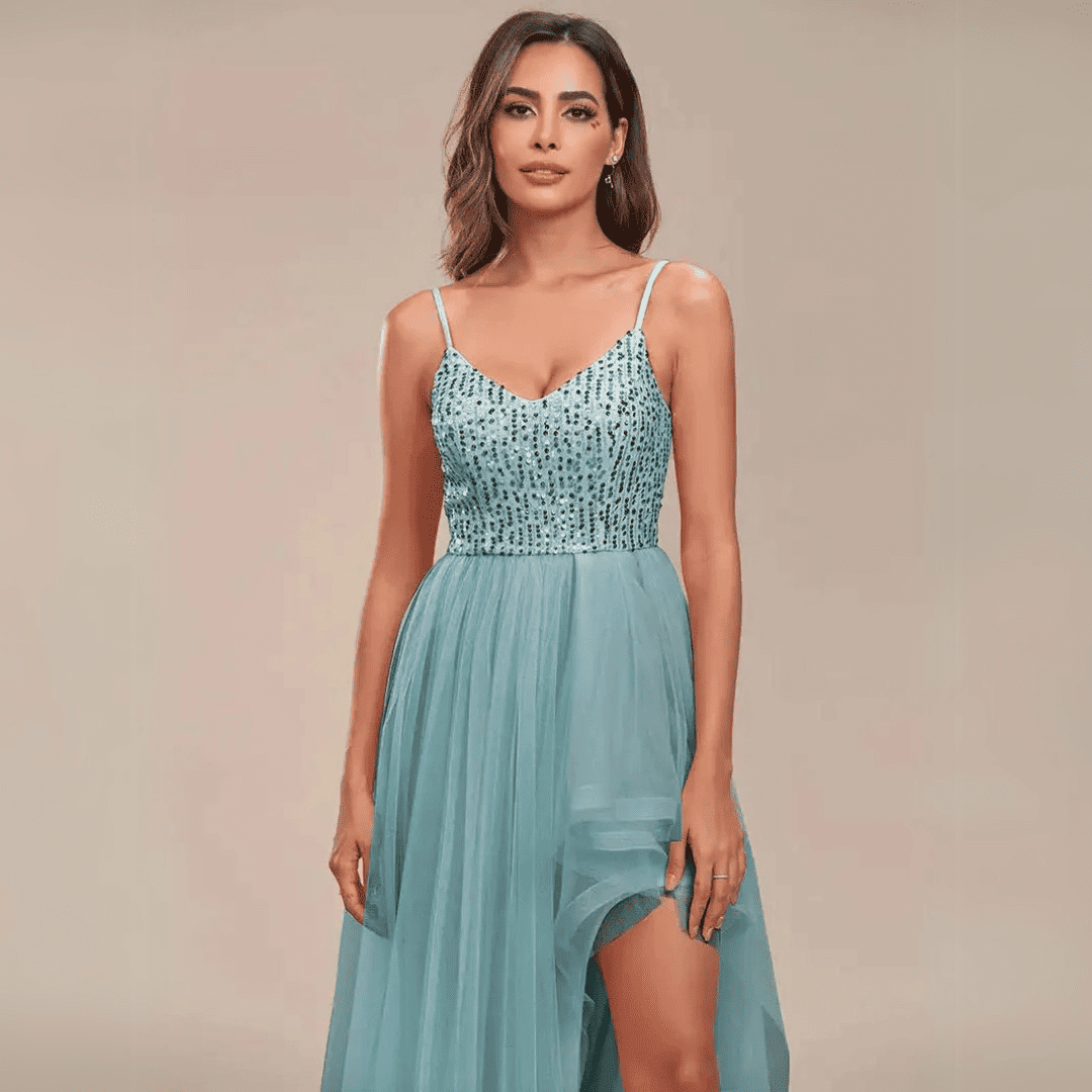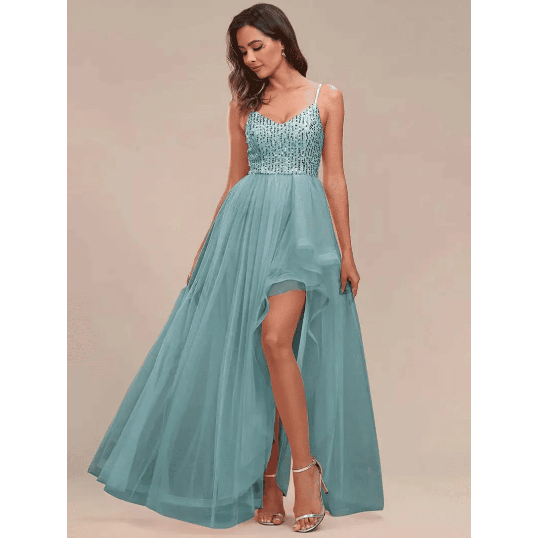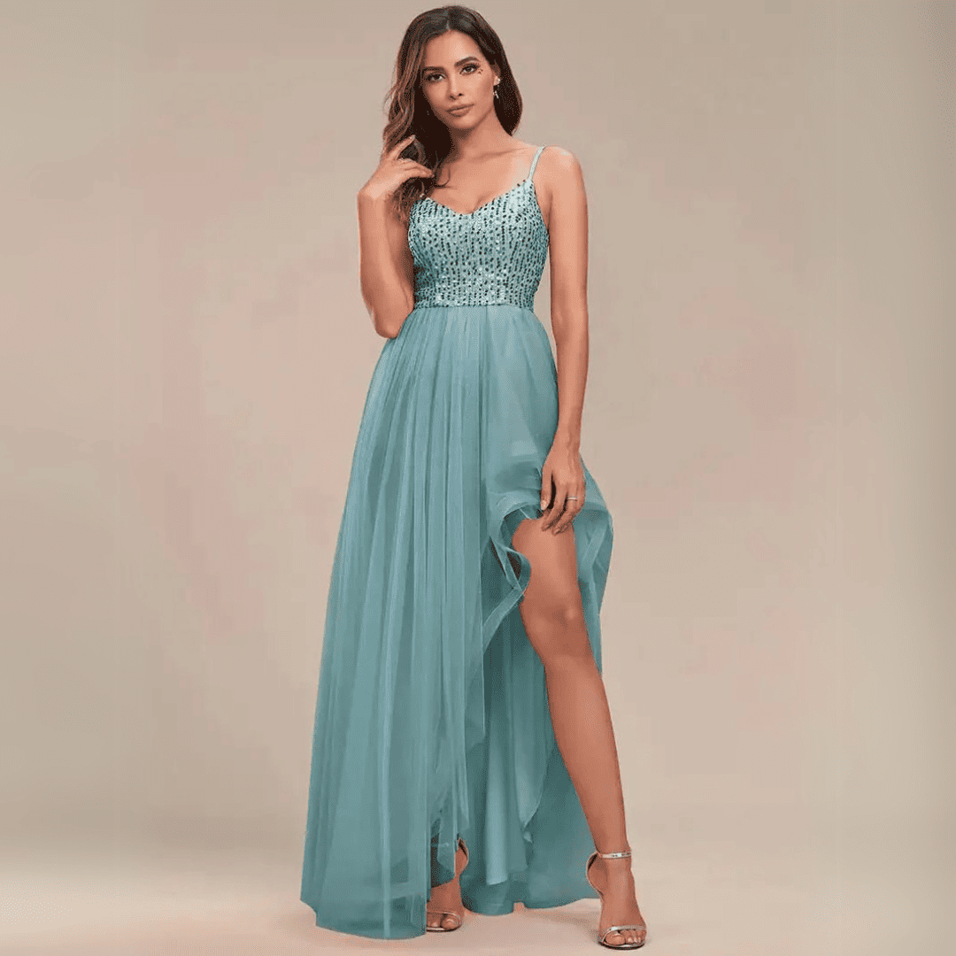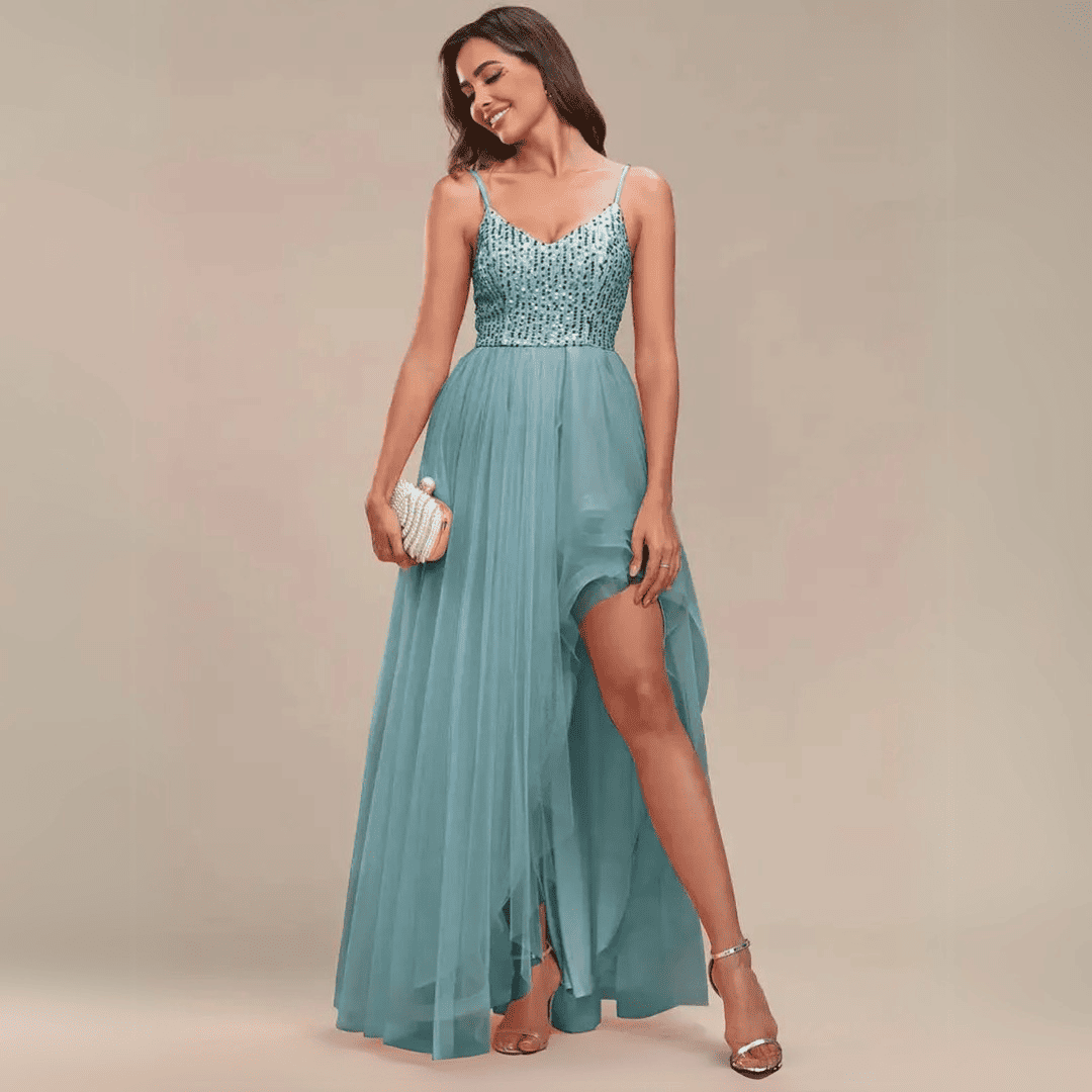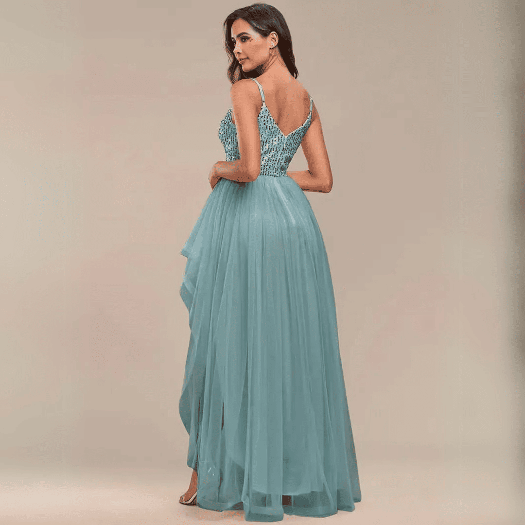 Dodaj odrobinę magii do wyjątkowych chwil dzięki tej asymetrycznej sukni z cekinami i tiulem. Jej elegancki krój z dekoltem w kształcie litery V, delikatnymi ramiączkami i modnym asymetrycznym dołem sprawia, że idealnie nadaje się dla druhen. Dostępna w subtelnych kolorach: pudrowy róż i przydymiony błękit.