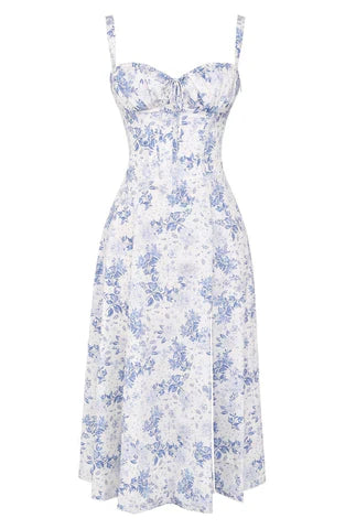 Katharina - Niebieska sukienka midi z kwiatowym wzorem i podkreśloną talią