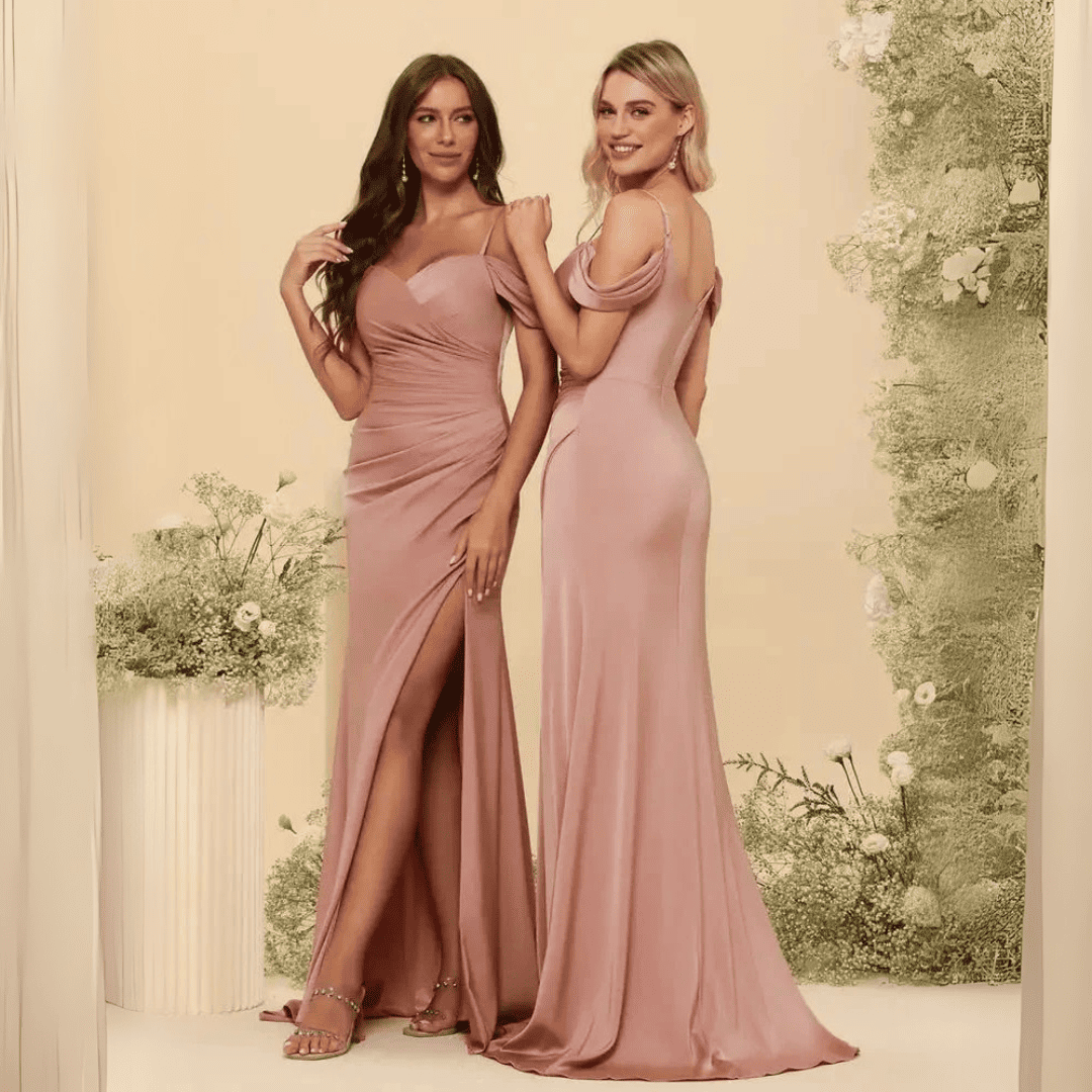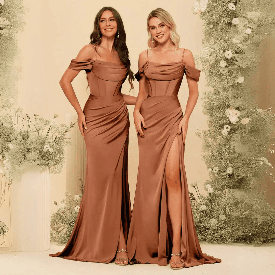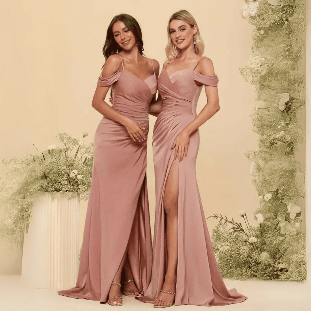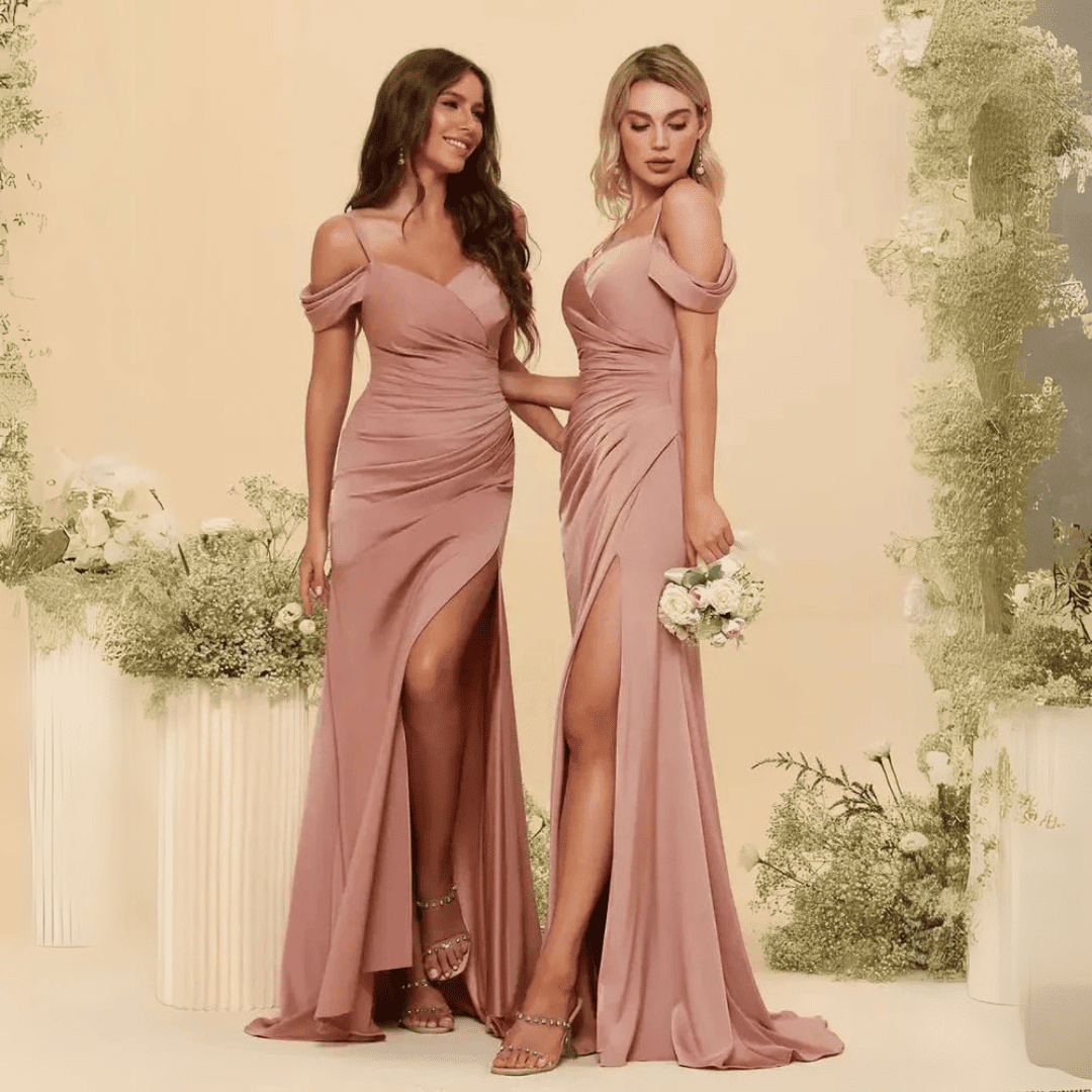 Olśnij na każdym weselu w tej luksusowej, różowo-złotej sukni druhny z odkrytymi ramionami. Zaprojektowana z dekoltem w kształcie serca, odkrytymi plecami i eleganckim satynowym wykończeniem, ta sukienka o długości do ziemi wyróżnia się zmysłowym rozcięciem oraz marszczeniami, które dodają jej niewymuszonego uroku i klasy.