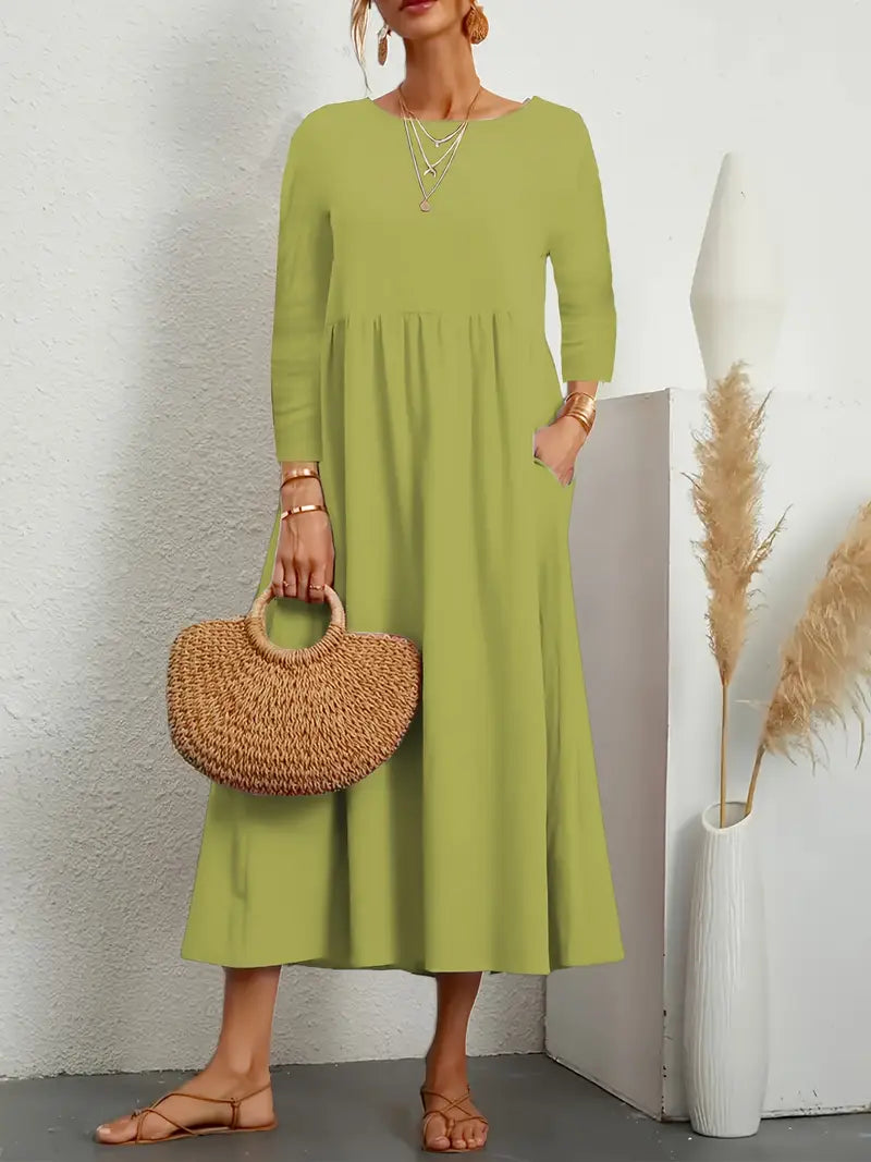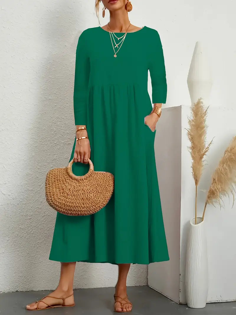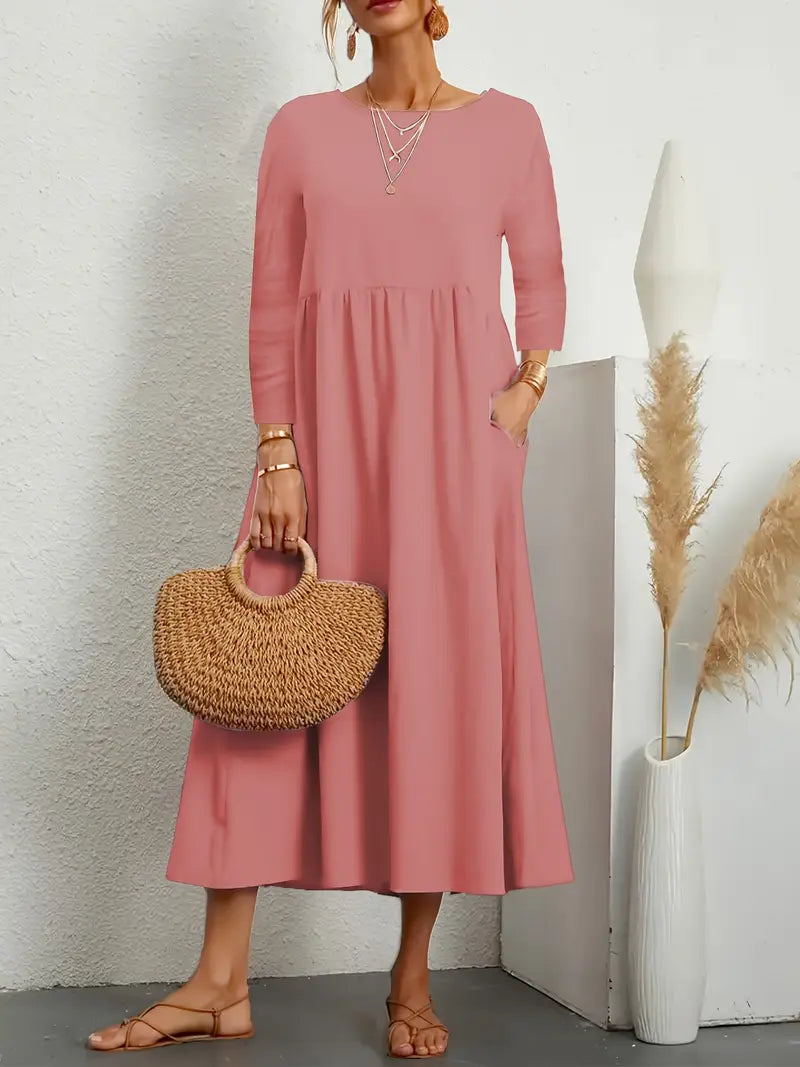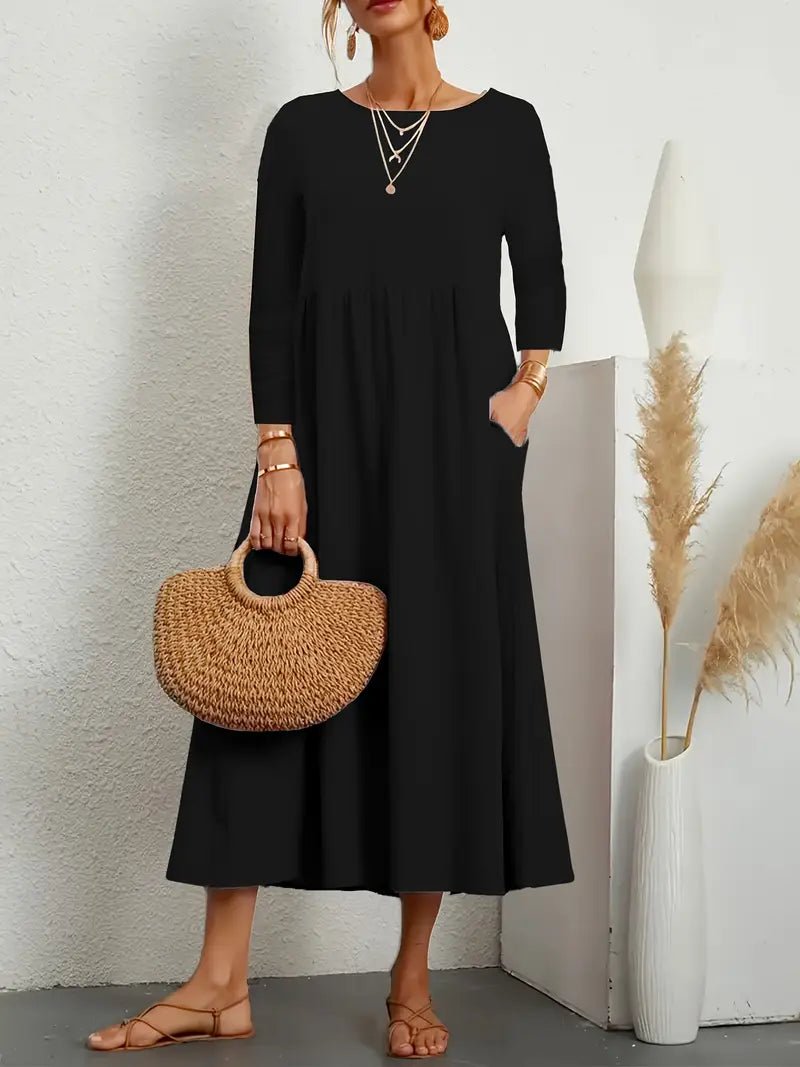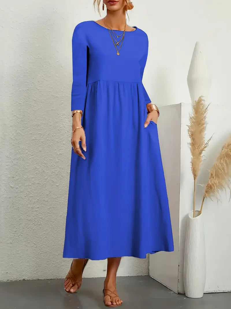 Klasyczna casualowa sukienka midi z długim rękawem i okrągłym dekoltem