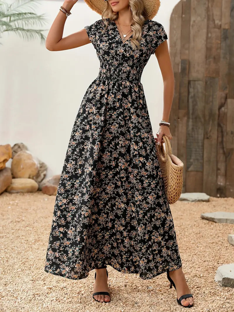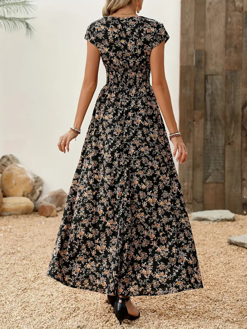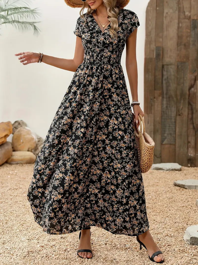 Kwiecista sukienka maxi z dekoltem w szpic Zwiewna sukienka letnia Kolor kawowy Casual