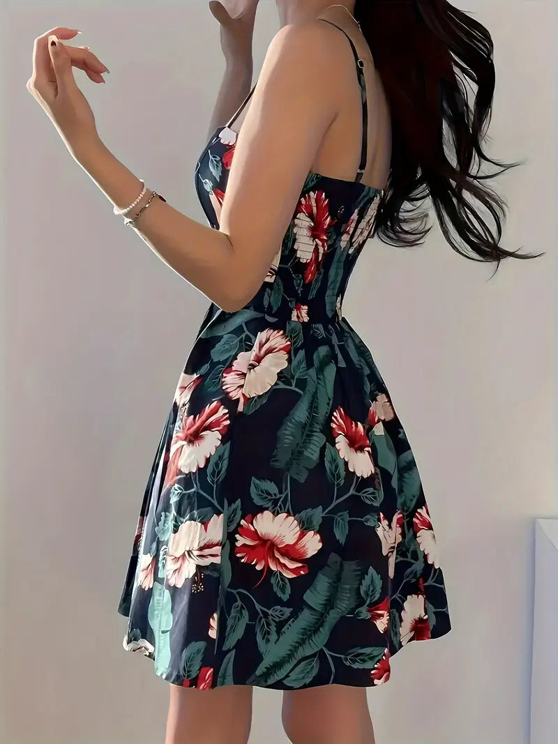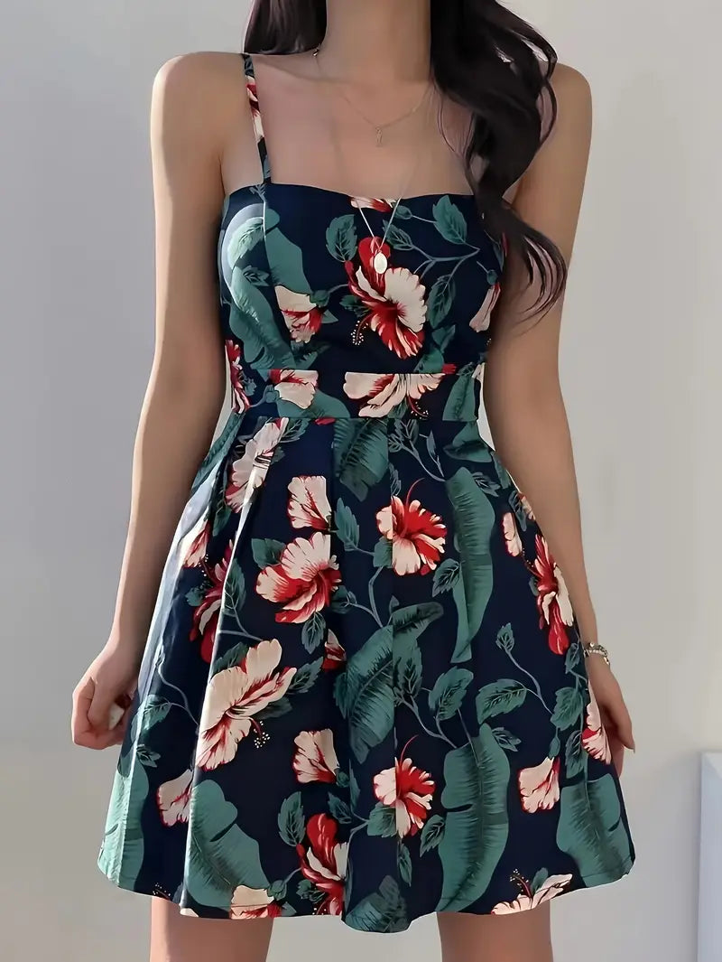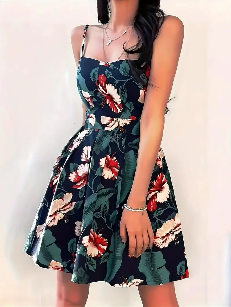 Letnia sukienka bez ramiączek z kwiatowym nadrukiem - przewiewna sukienka bez rękawów w kształcie litery A z eleganckim wzorem Plissé
