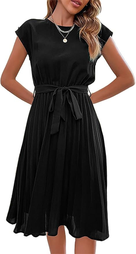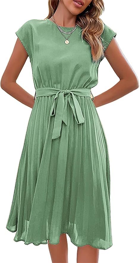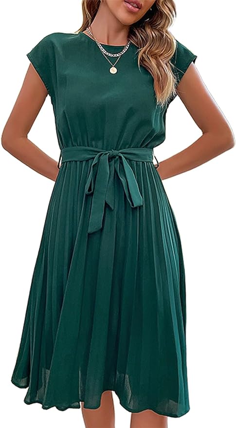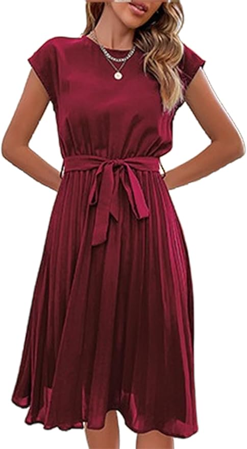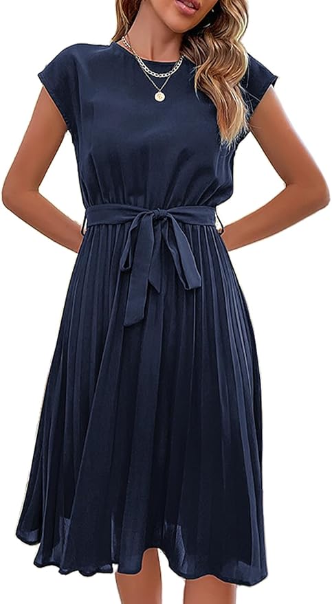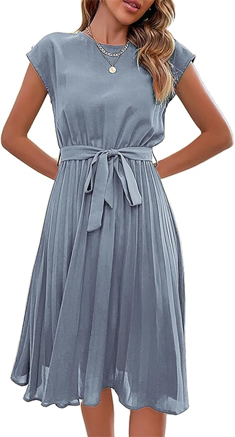 Letnia sukienka damska - Elegancka sukienka plisowana z krótkim rękawem, okrągłym dekoltem i przewiewnym krojem