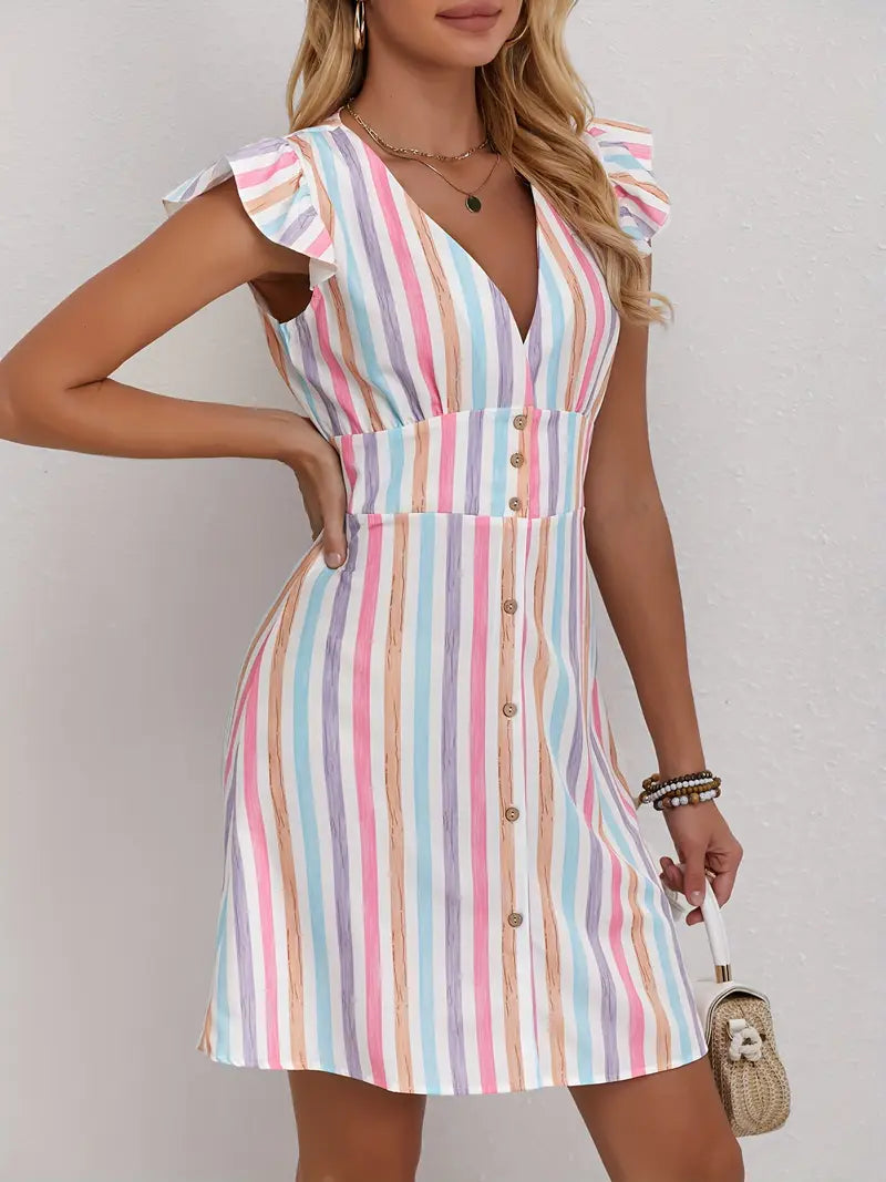 Letnia sukienka damska w paski - dekolt w szpic, guziki, eleganckie rękawy i przewiewność