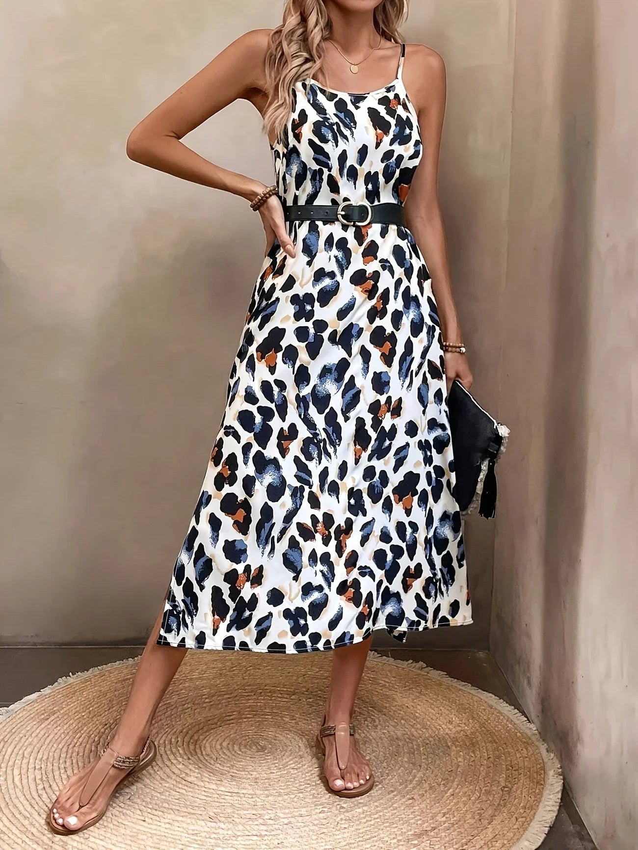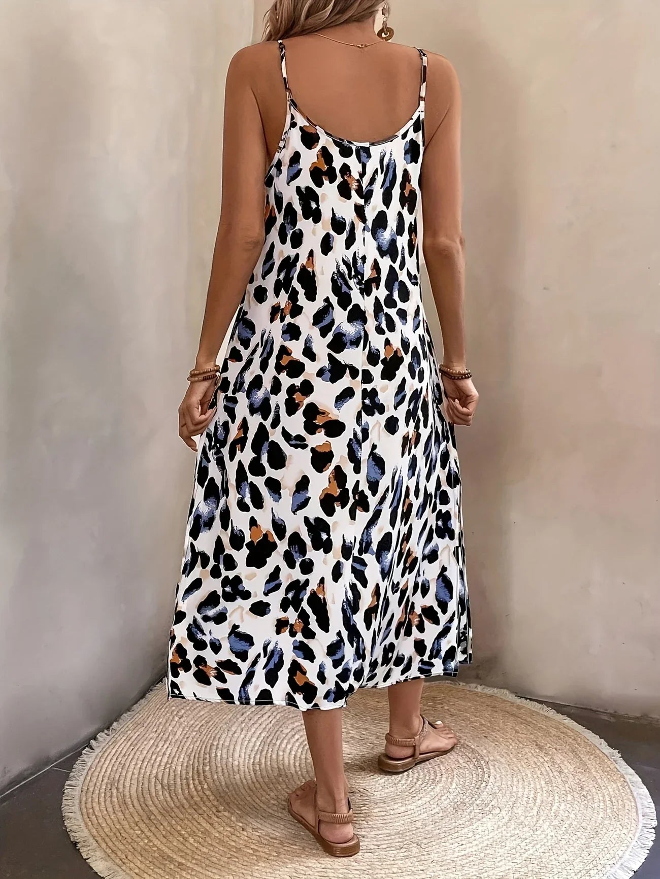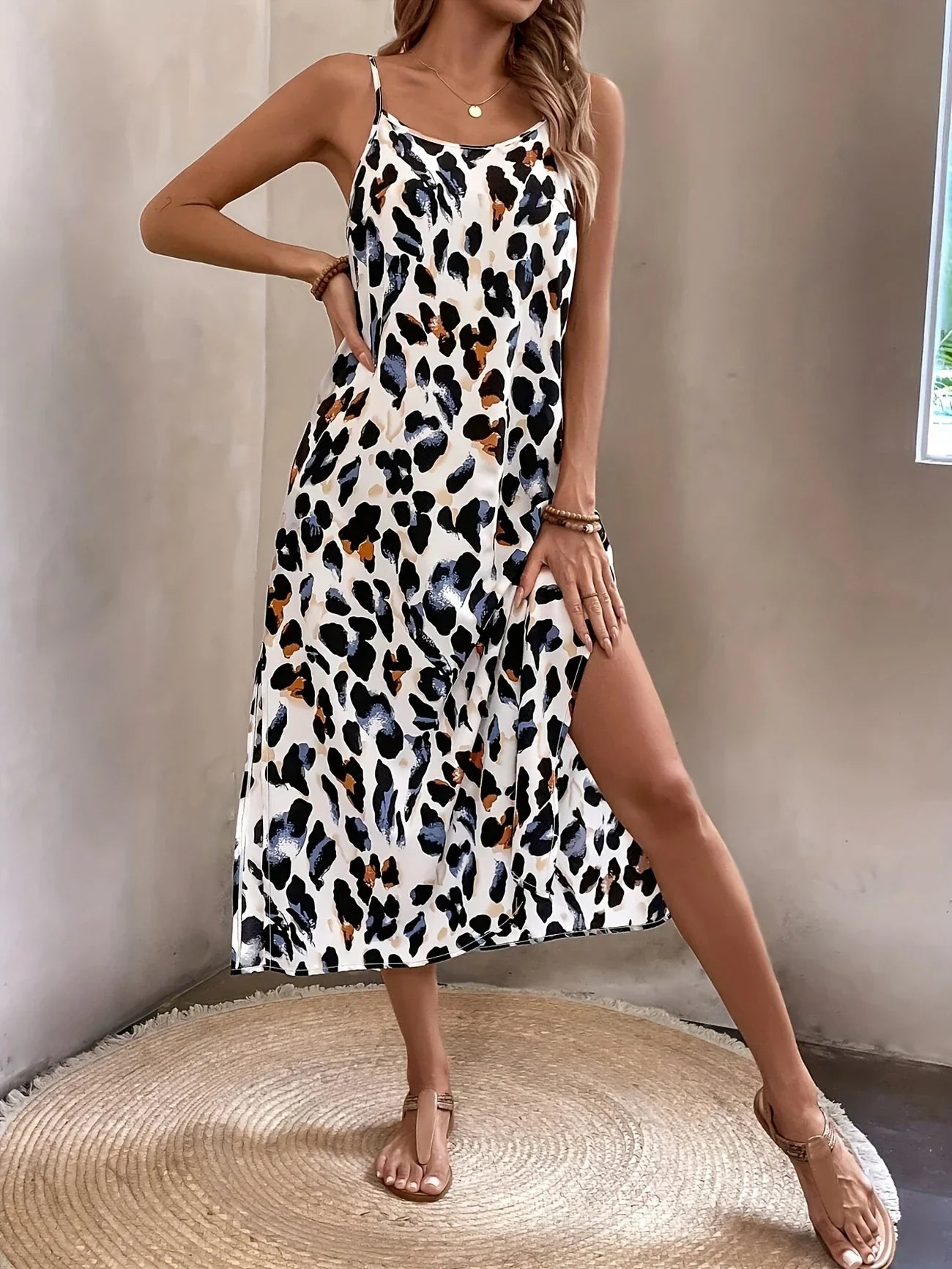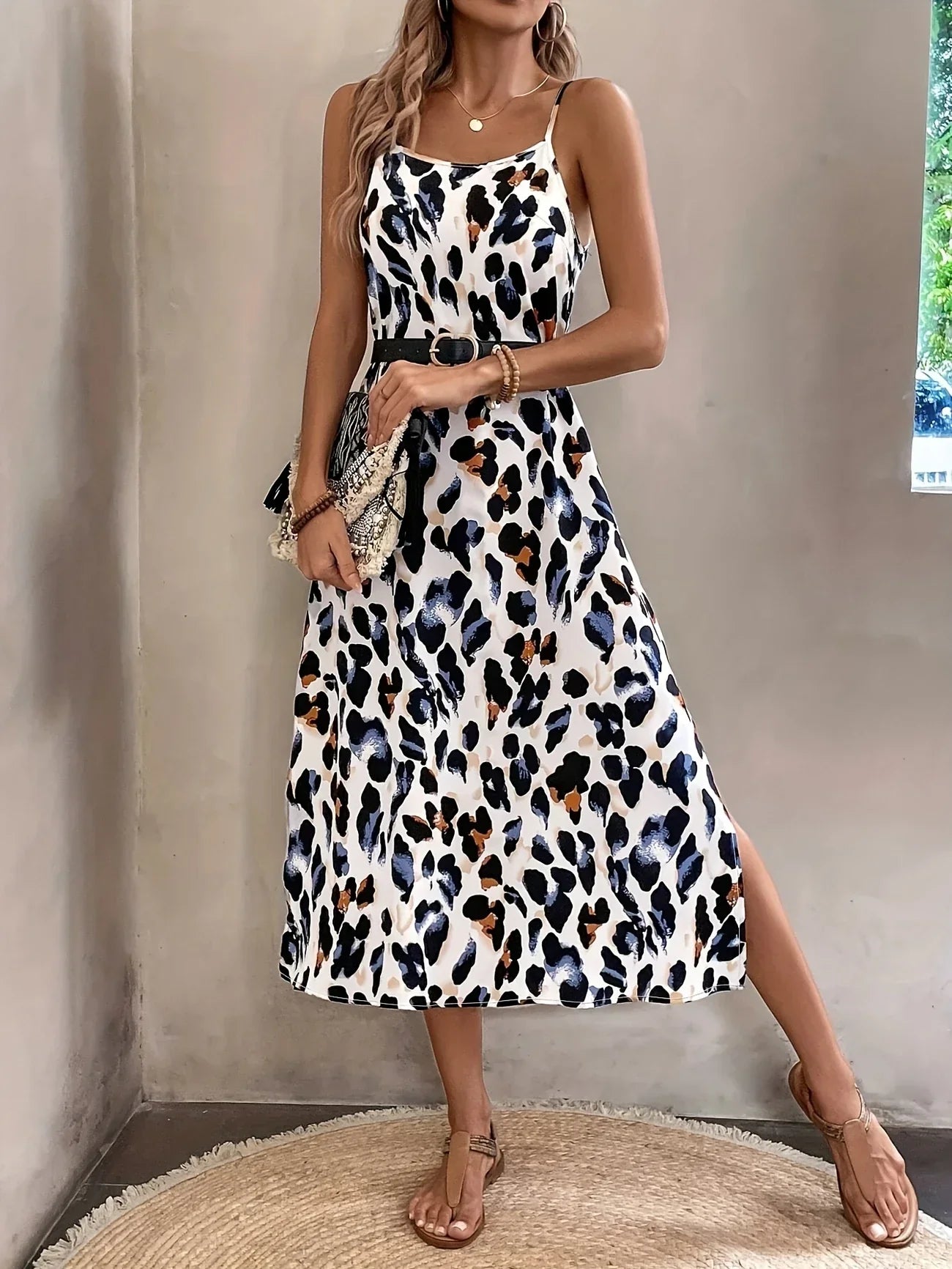 Letnia sukienka w panterkę Elegancka sukienka na ramiączkach z rozcięciem