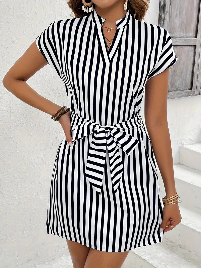 Letnia sukienka w paski z dekoltem w szpic, lekka i z paskiem