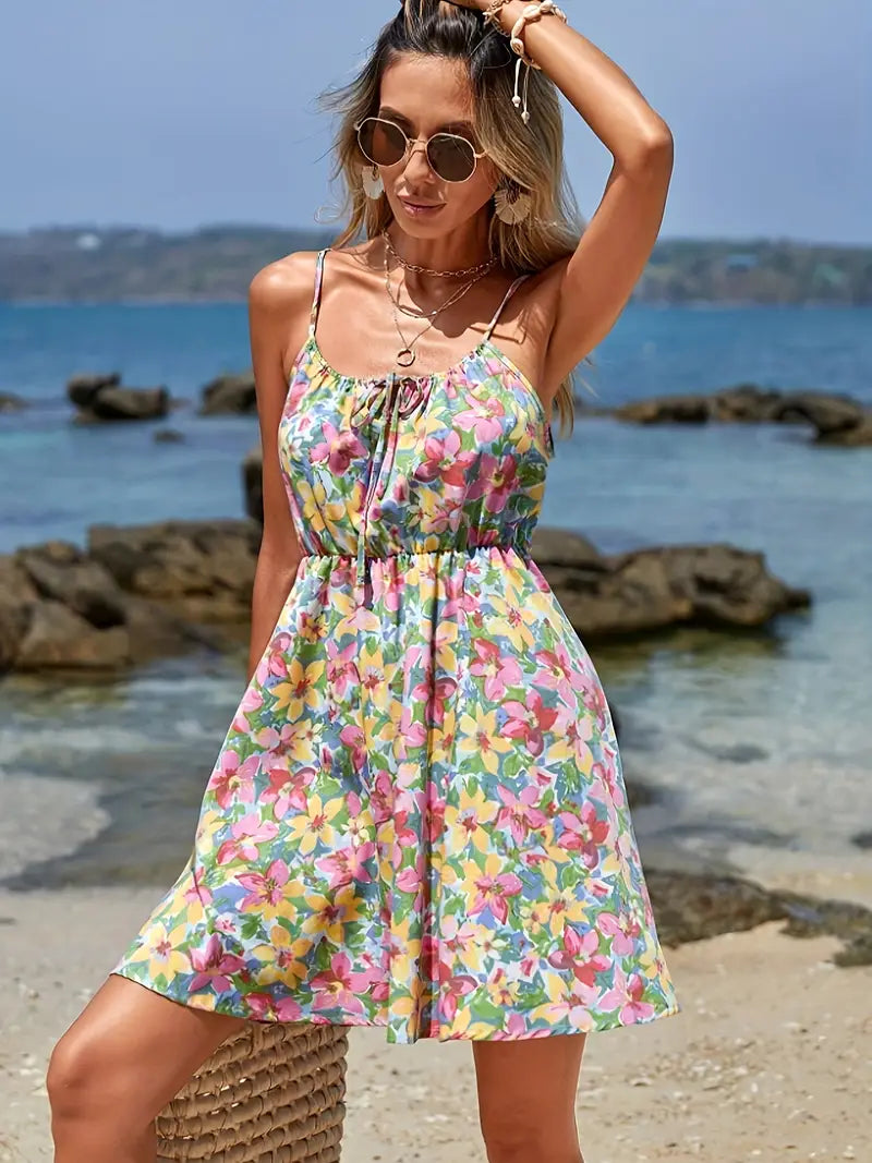 Letnia sukienka z kwiatowym nadrukiem - przewiewna sukienka poliestrowa z ramiączkami do spaghetti i regulowaną kokardką