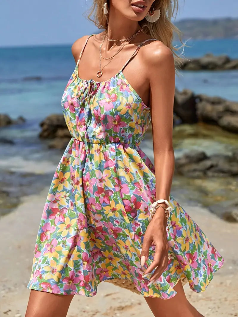 Ta elegancka letnia sukienka z kwiatowym nadrukiem to obowiązkowy element garderoby na gorące dni. Przewiewna tkanina poliestrowa jest przyjemna w dotyku i zapewnia najwyższy komfort noszenia. Dzięki ramiączkom typu spaghetti i regulowanej wstążce z kokardą można łatwo dopasować dopasowanie. Wyzywający krój i świeży design sprawiają, że ta sukienka jest idealna na wakacje, dni na plaży lub letni wypad do miasta.