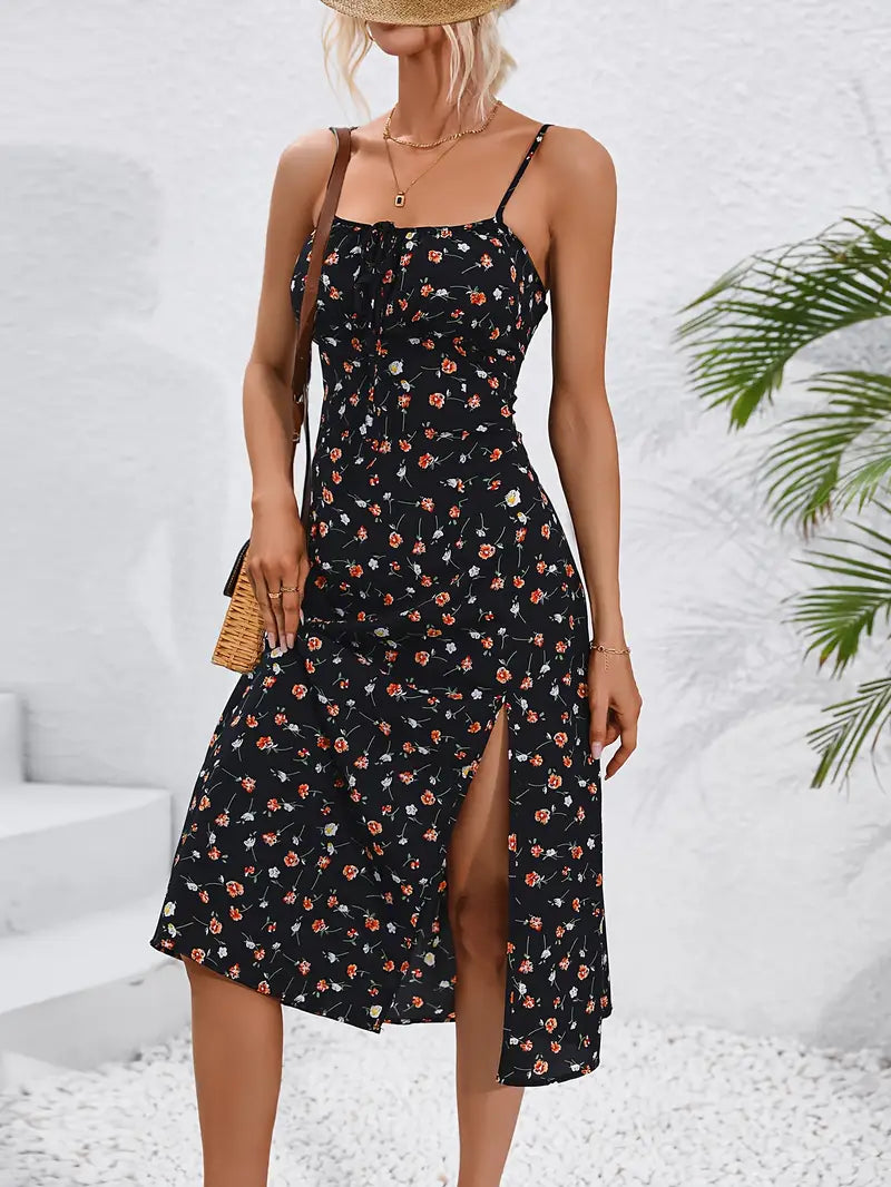Letnia sukienka z rozcięciem Elegancka sukienka wakacyjna z nadrukiem na ramiączkach Spaghetti