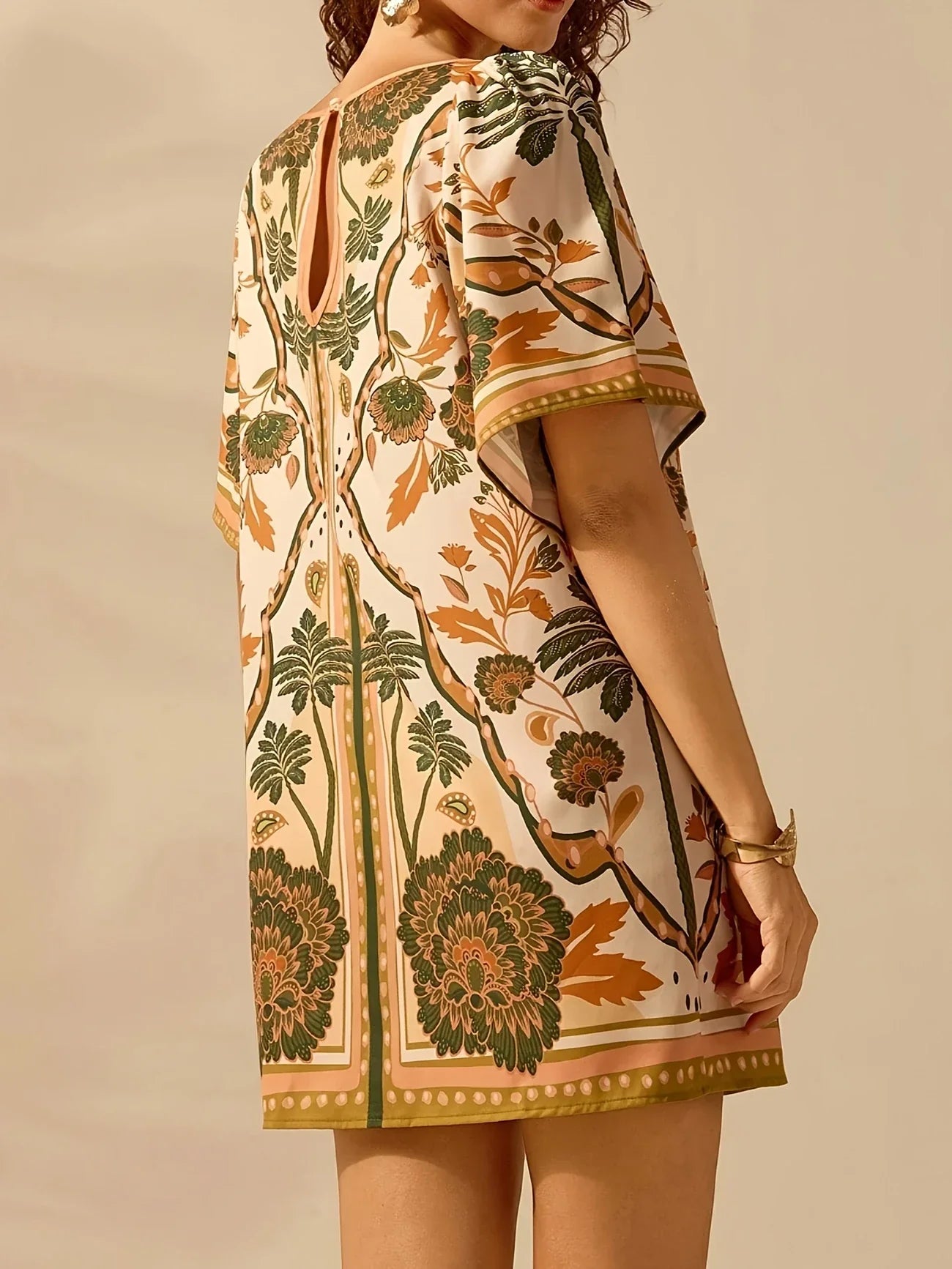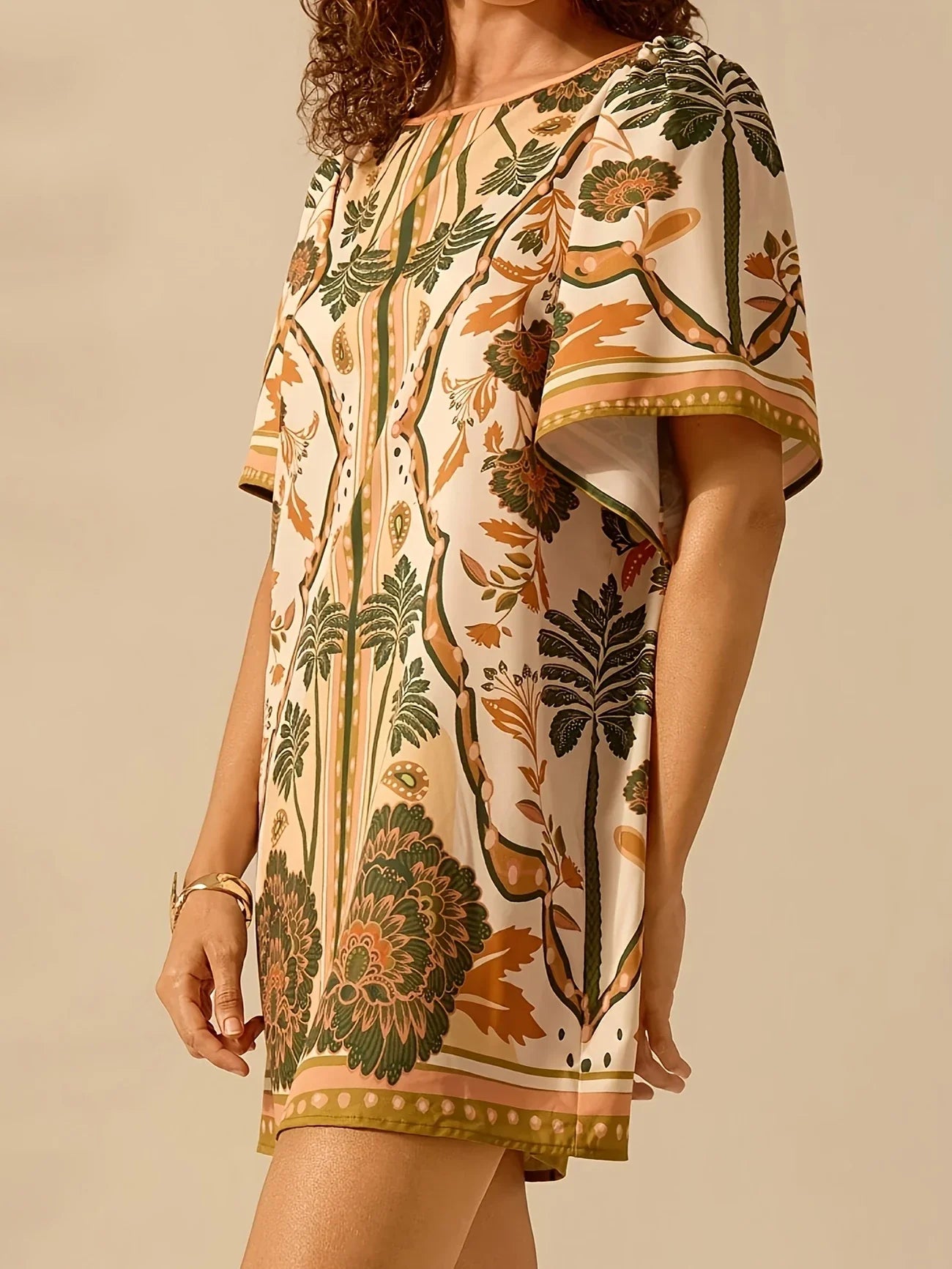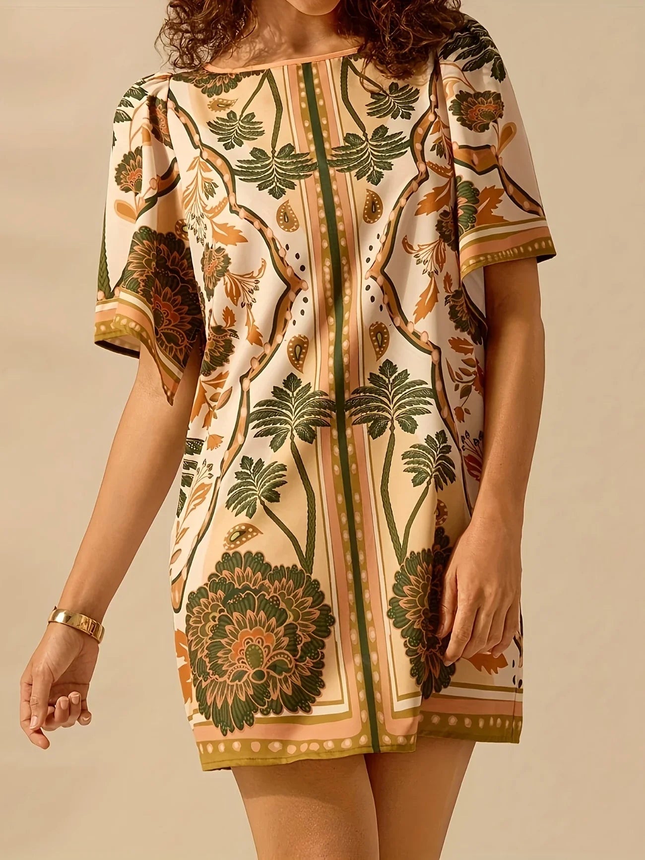 Letnia sukienka z tropikalnym nadrukiem - krótkie rękawy, okrągły dekolt i przewiewny krój
