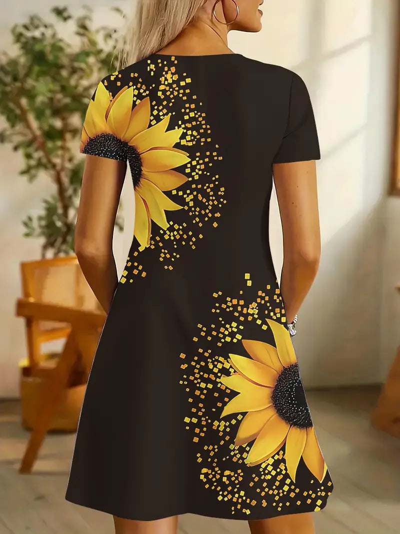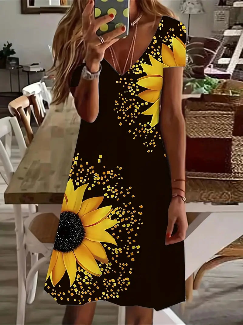 Letnia sukienka ze słonecznikami z dekoltem w serek z peplum midi czarna