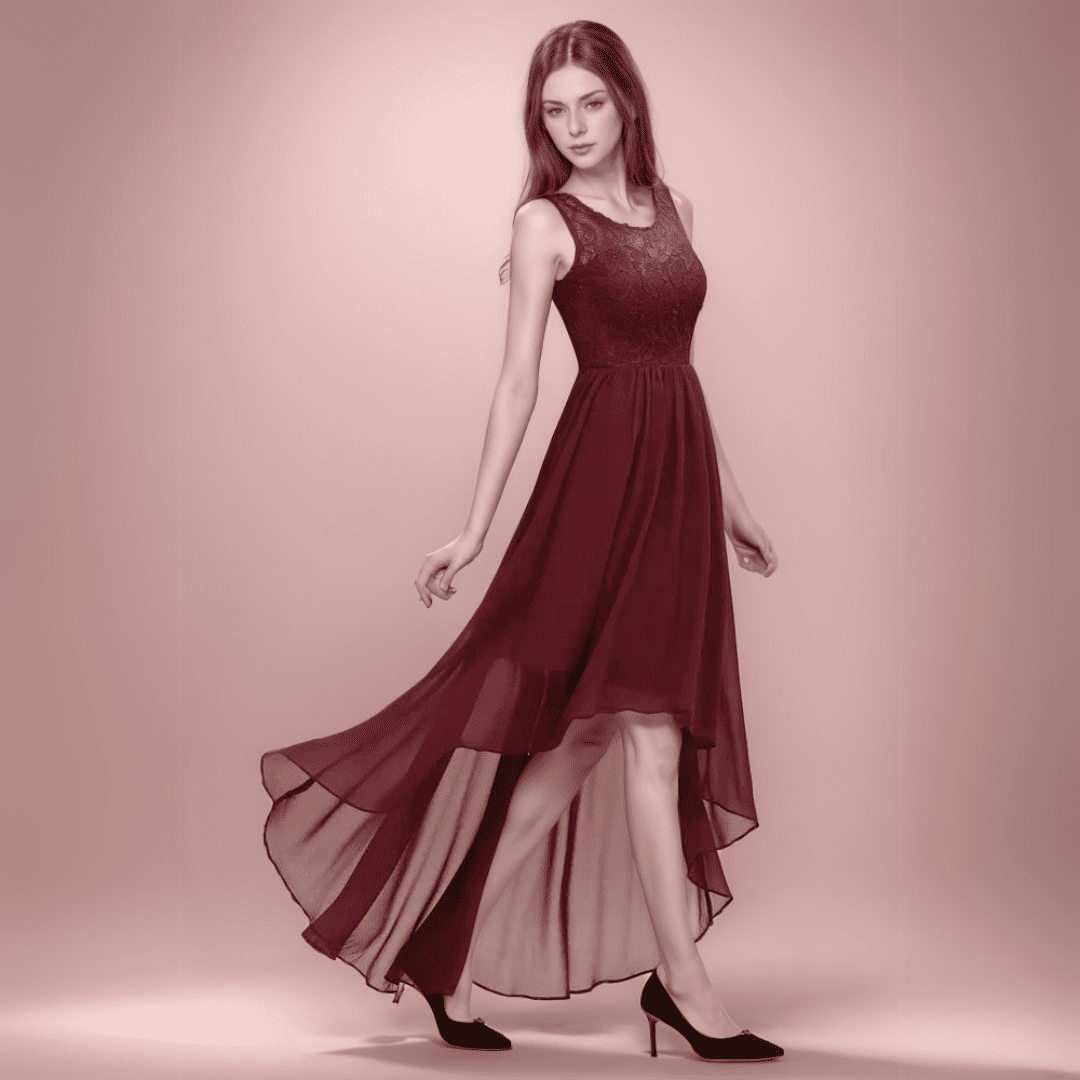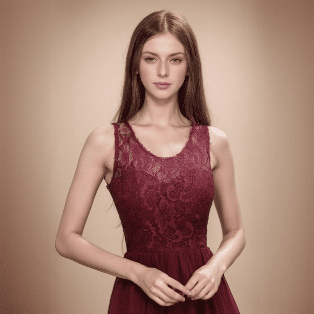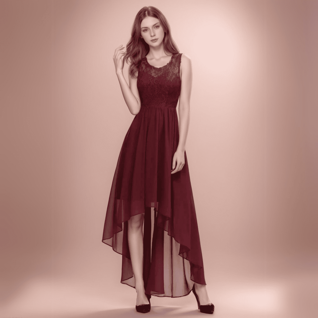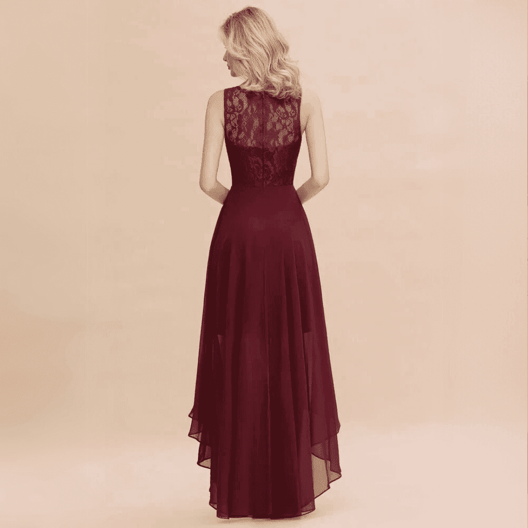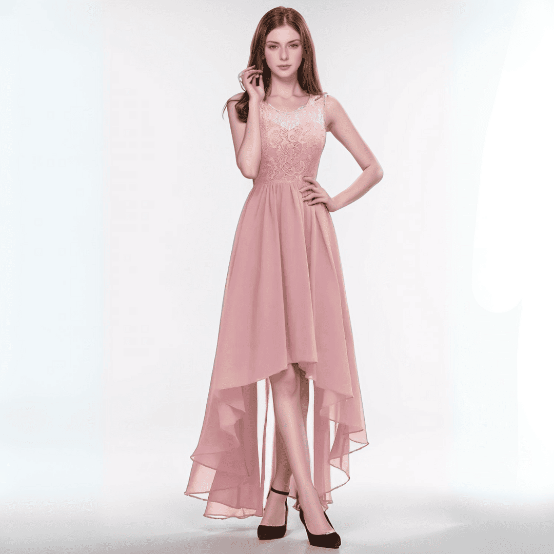 Zachwycająca sukienka dla druhen z eleganckim dekoltem w kształcie O i koronkowymi aplikacjami, które dodają klasy. Asymetryczny krój i talia empire podkreślają sylwetkę, a długość od herbacianej do kolanowej sprawia, że jest idealna na każdą okazję.