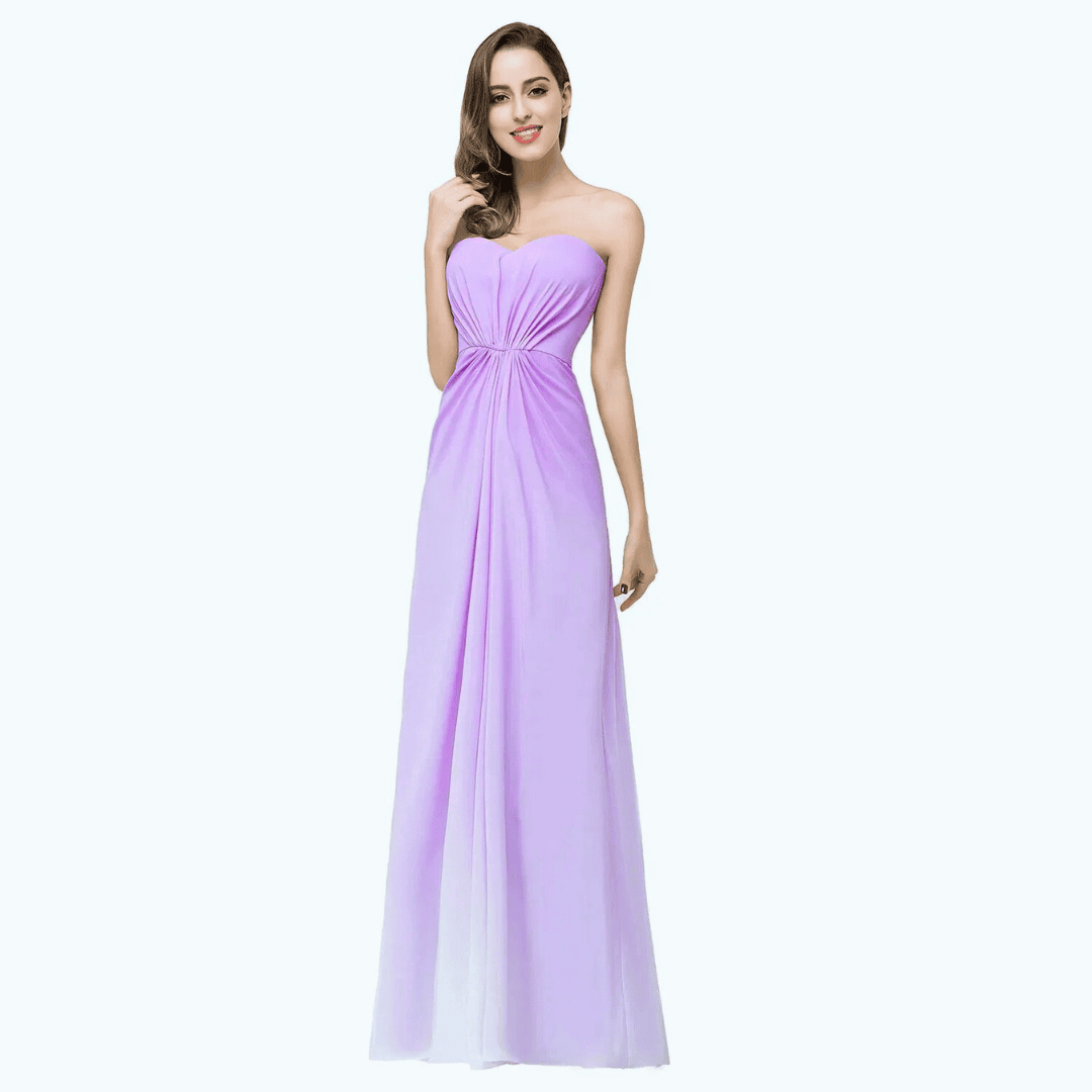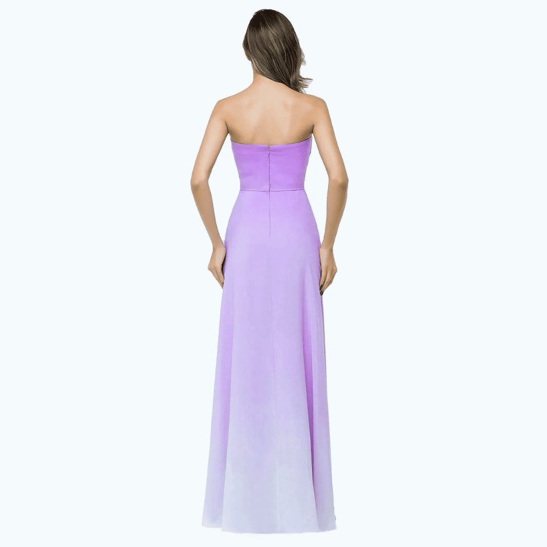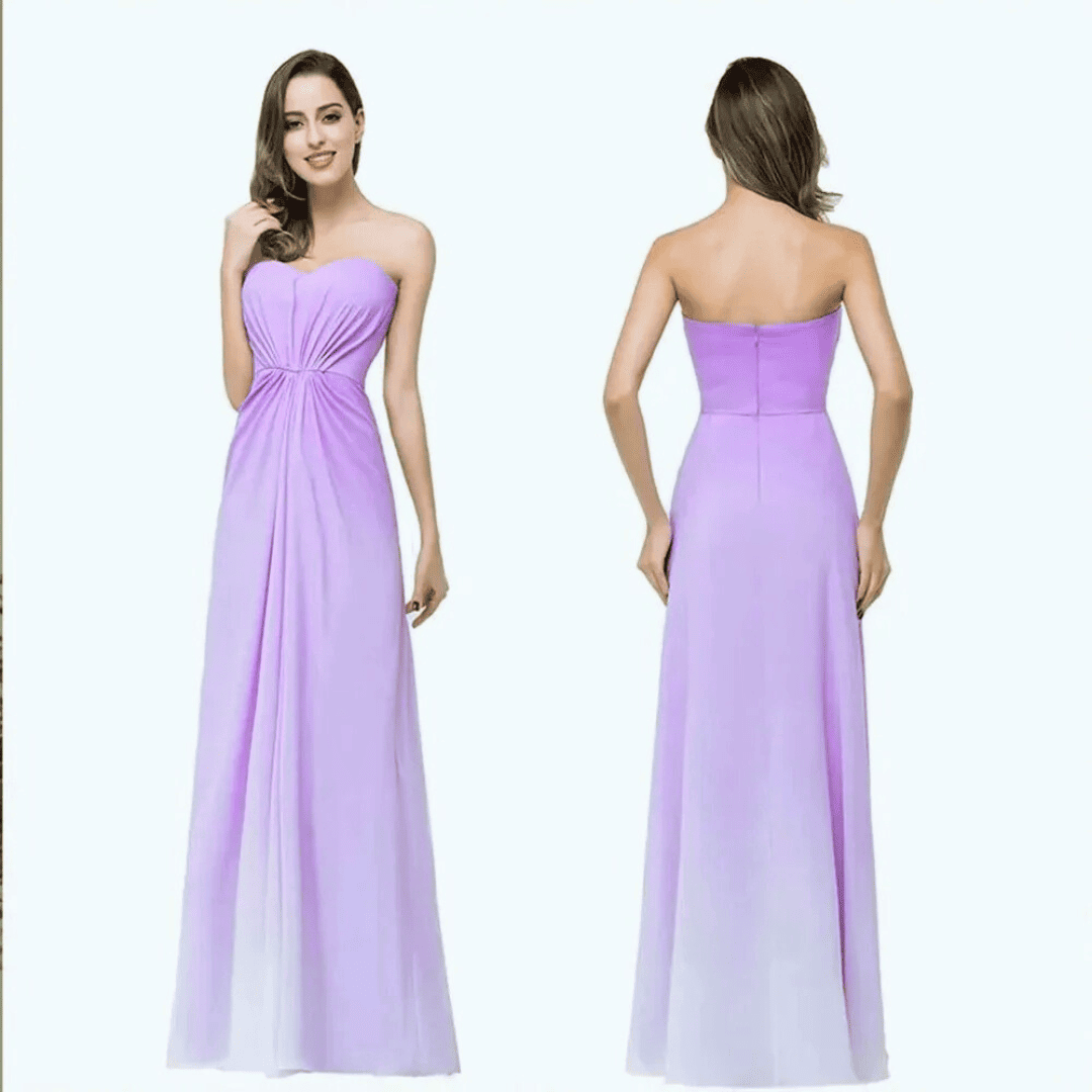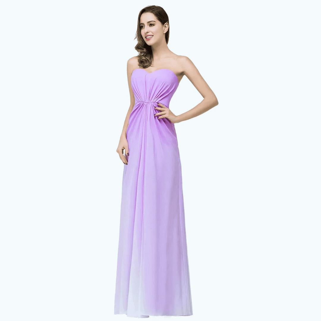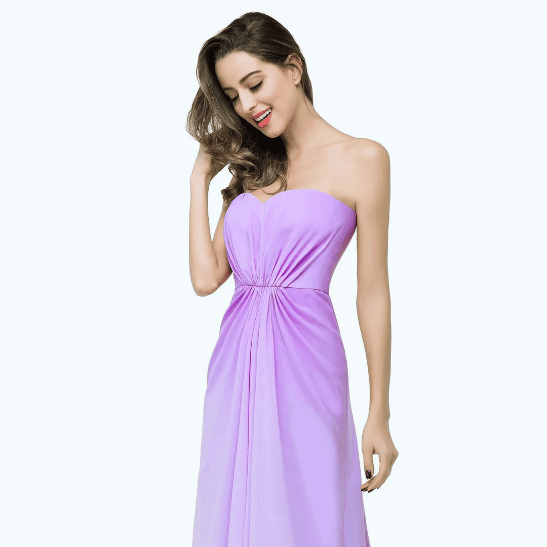 Dodaj romantyczny akcent do swojej uroczystości dzięki lawendowej sukni z szyfonu, idealnej dla druhen. Ta długa suknia podkreśla szyk dzięki gorsetowemu dekoltowi i odkrytym plecom, tworząc elegancki i niezapomniany efekt. Delikatne marszczenia i plisy modelują sylwetkę, dodając jej wyjątkowego uroku.