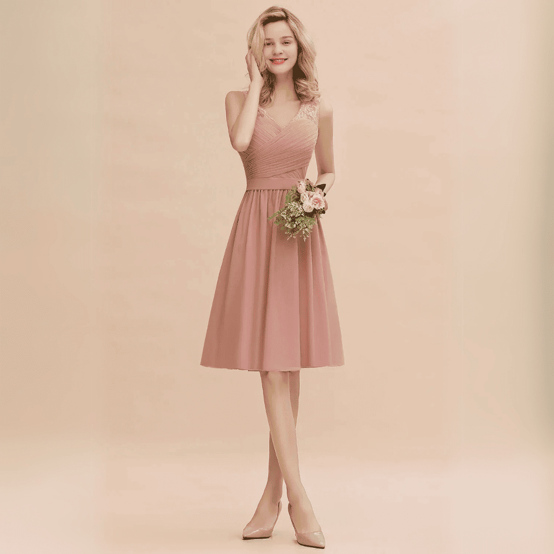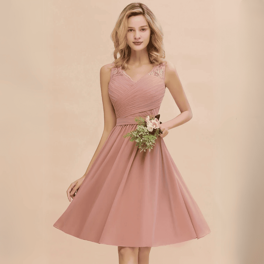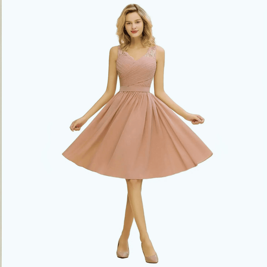 Krótka sukienka Marianna z szyfonu w kolorze pudrowego różu to idealny wybór na wesela. Zmysłowy dekolt w kształcie litery V, bez rękawów, uzupełniony paskiem zapewnia elegancki, dopasowany wygląd. Długość do kolan gwarantuje wygodę i swobodę ruchów.