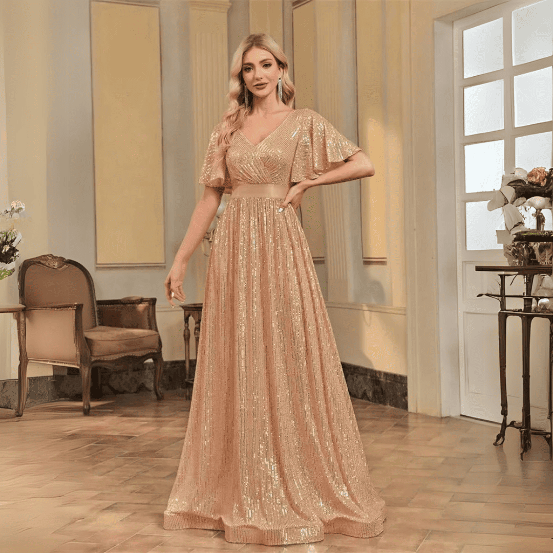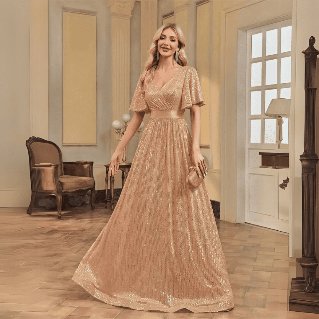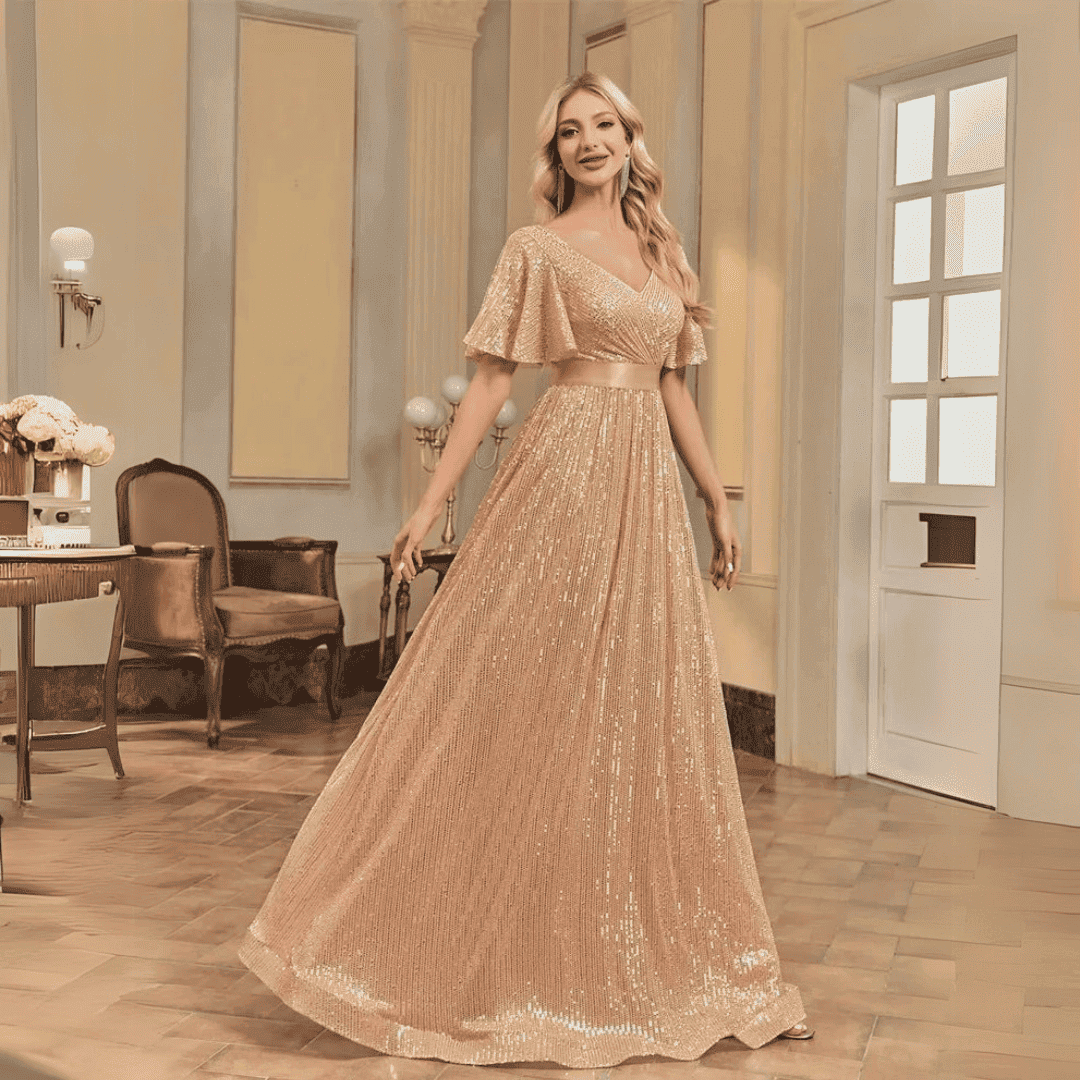 Zostań gwiazdą wieczoru dzięki tej olśniewającej sukni z cekinami, idealnej dla druhen lub na eleganckie przyjęcia. Klasyczny krój w kształcie litery A z paskiem podkreśla talię, a dekolt w kształcie litery V i krótkie rękawy dodają elegancji. W złotym kolorze z łatwością przyciągniesz uwagę i rozświetlisz każde wydarzenie.